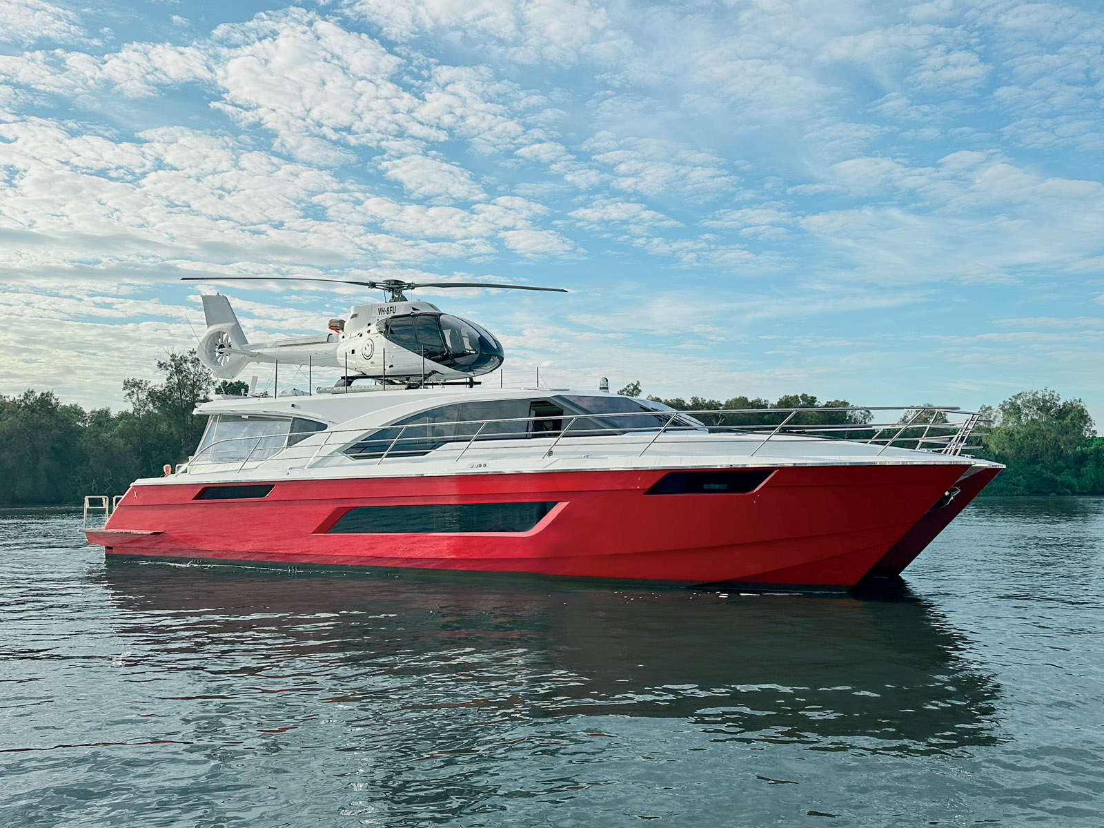 Pour repérer le catamaran au milieu du salon nautique de Sanctuary Cove, il suffit de suivre l’hélicoptère, ou plutôt de repérer le bel oiseau blanc posé sur le toit du Voodoo et qui, ça va de soi, fait donc office d’hélipad. Tout en grimpant dessus, le cofondateur de la société, Mitch Pachoud, m’explique que le toit a été conçu et renforcé avec une structure supplémentaire en fibre de carbone pour pouvoir accueillir cet Airbus H130 à sept places. L’hélicoptère utilise le XF75 comme navire-mère, il n’est donc a priori présent à bord que lorsque le Voodoo est à l’arrêt et pour le ravitaillement, via un système conçu sur mesure et un réservoir Jet A-1 de 3 000 litres. Le Propriétaire australien, un plaisancier expérimenté qui vient d’un grand monocoque à flybridge, voulait un navire capable d’atteindre rapidement les régions les plus reculées du nord de l’Australie, puis de les explorer par voie aérienne et maritime – tout s’explique.