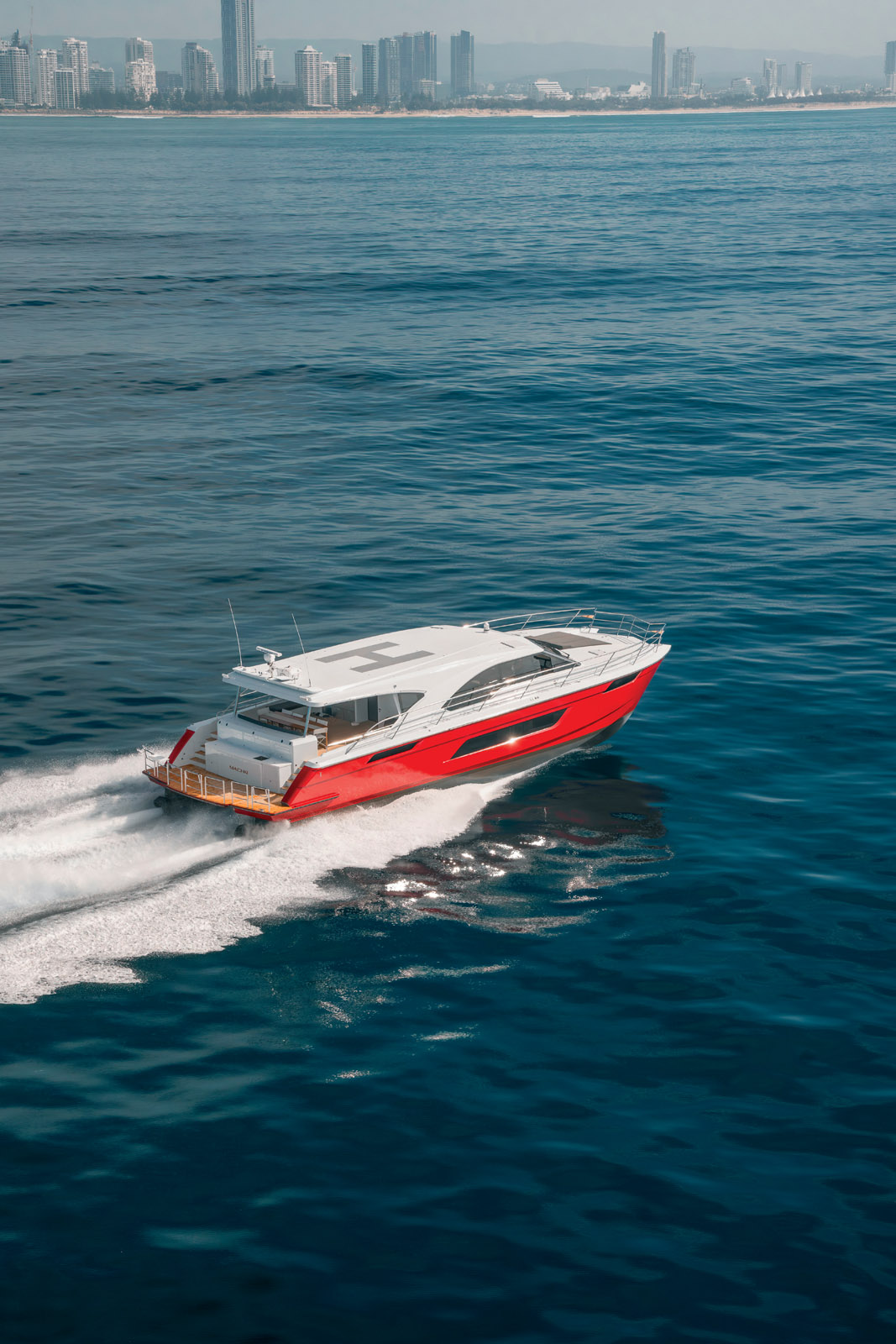 Pour mettre à l’épreuve ce catamaran, nous n’avons pas choisi la facilité, puisque l’entrée de la Gold Coast Seaway est l’une des passes parmi les plus difficiles de la côte est de l’Australie, de plus, le récent cyclone Alfred a créé de nouveaux hauts-fonds. Des vagues de deux mètres déferlaient sur la majeure partie de cette voie navigable. C’est la scène à laquelle a été confronté le XF75, alors que le rugissement des vagues se mêlait à celui des MTU poussant la coque à se cabrer pour affronter les vagues qui arrivaient. A la barre, le skipper Dave Pachoud actionnait le joystick de commande, nous avons carrément décollé, la coque de 75 pieds jaillissant franchement au-dessus de la crête des vagues de deux mètres qui se brisaient. Puis, de manière surprenante, il y eut seulement un léger bruit sourd lorsque nous avons atterri, sans aucun tremblement, vibration ou grincement des équipements internes. Impressionnant. Mais ce n’était que le début du plaisir, car nous avons mis le cap vers les gratte-ciel de Surfers Paradise pour foncer droit dans la houle du sud, atteignant la vitesse stupéfiante de 45 nœuds, avec seulement quelques embruns occasionnels sur les vitres du poste de pilotage. En poussant légèrement le joystick, nous avons effectué un virage assez plat, mais néanmoins serré. Les performances du XF75 nous ont permis de choisir entre surfer sur les vagues ou les devancer, et cela sans aucune nervosité, contrairement à ce que l’on pourrait attendre d’un bateau sans safrans. La large nacelle et les coques ont également conféré au XF75 une stabilité exemplaire à grande vitesse, et cela nous a prouvé que ce multiyacht peut rendre vos voyages vers des destinations lointaines palpitants sans pour autant vous mettre en danger ou rendre la croisière inconfortable.