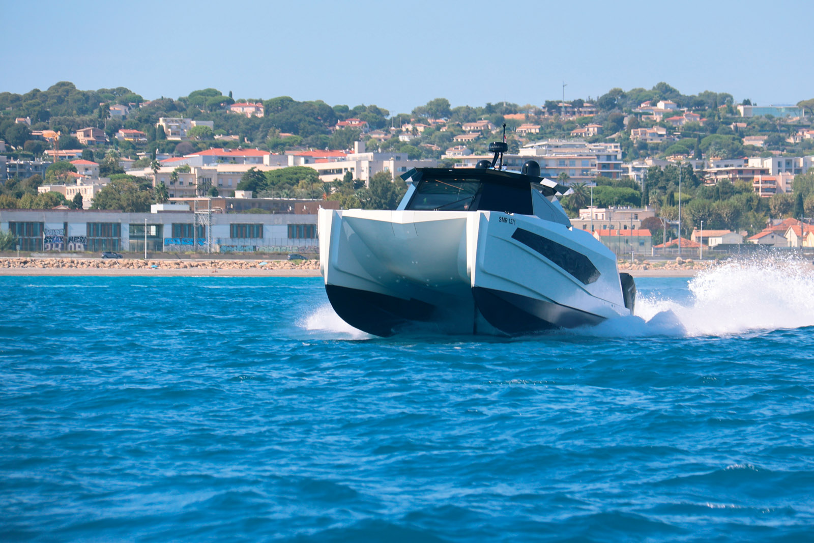 Une fois à la barre, on apprécie en premier lieu le réglage du siège, qui permet de trouver la bonne position. L’autre bonne surprise, c’est le faible niveau sonore grâce à la discrétion des V12 Mercury, mais aussi au bon travail d’isolation fait sur ce powercat. Comme il se doit avec les 600 ch, on pousse doucement la poignée des gaz. Ensuite, tout s’enchaîne naturellement. Le déjaugeage s’effectue autour de 3 000 tr/min, et la « montée » sur foils très peu de temps après. A partir de là, le Wama affiche une légèreté et une souplesse à la barre remarquables. En dépit des 50 centimètres de creux de la baie d’Antibes, rien ne semble perturber le powercat tunisien. J’enchaîne quelques virages et, là encore, bonne surprise, les foils ne décrochent pas, les courbes se prennent à plat, au grand plaisir de l’équipage qui peut vaquer à ses occupations sans être en mode survie. Profitant de la confortable puissance disponible, je pousse la manette pour quelques évolutions rapides. Le GPS grimpe à 25 nœuds, puis à 30, 35, et nous touchons un max de 38 nœuds, un peu en deçà des 40 nœuds annoncés par le chantier, mais, dans 50 cm de creux et avec 7 personnes à bord, c’est tout à fait honorable. Qui plus est, notre hélice est un peu trop grosse, puisque nous ne passons pas 5 700 tr/min et surtout, ce résultat ne s’obtient pas dans la douleur, mais dans un confort remarquable. Dans cette configuration, la vitesse de croisière s’établit entre 25 et 27 nœuds, ce qui est parfait pour un programme familial. De même, la version essayée, avec deux Mercury V12 de 600 ch, devrait plutôt attirer une clientèle nord-américaine ou basée au Moyen-Orient, alors que pour l’Europe, c’est certainement la version avec deux Yanmar diesel de 440 ch qui aura la faveur des clients.