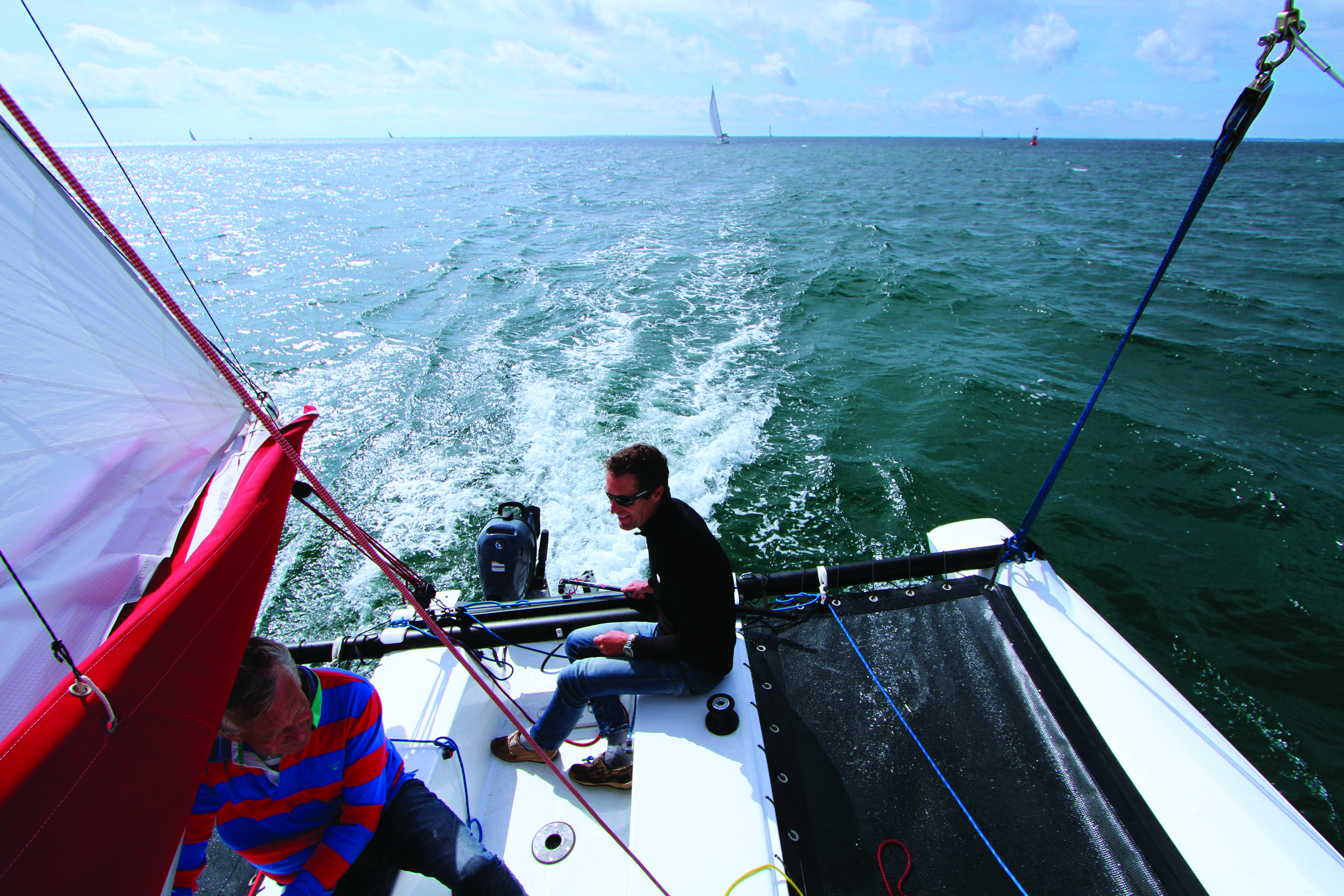 Le moteur, positionné assez loin du barreur, n’est pas très facile d’accès lors de la mise en route, de la réduction ou accélération des gaz, ou encore du braquage pour les manœuvres. Mais une fois en route, on se rend vite compte qu’une très faible puissance de 3 CV suffit largement à propulser ce poids plume. La mise en place des voiles est évidemment aisée vu les petites surfaces. Quelques nœuds de vent suffisent à démarrer le 20.5 : particulièrement véloce, il accélère à la moindre risée et vire sur place sans broncher. Au près, le cap est excellent. Impossible de se rendre compte, à la barre, que notre dérive est décentrée sur la coque centrale – encore une astuce pour ne pas encombrer l’intérieur. A noter : cette dérive comme le safran sont pivotants et sont tous deux équipés d’un taquet déverrouillable. En revanche, pour obtenir un rendement optimal, le bon réglage du point de tire du foc s’avère essentiel : le système d’écoutes mouflées sur points de tire fixes est perfectible. Le gennaker permet aux carènes de donner toute leur mesure – d’autant que le vent dans la baie de Quiberon frise maintenant les 15 nœuds : l’Astus progresse à 10 nœuds, pointes à 12. Le flotteur au vent ne touche plus l’eau, la coque centrale soulage un peu, la structure ne bouge pas d’un ongle… la marge de sécurité (et de vitesse !) est encore énorme. Dans le cockpit, on reste globalement au sec. Les embruns ne fouettent avec entrain que la zone sous le vent.