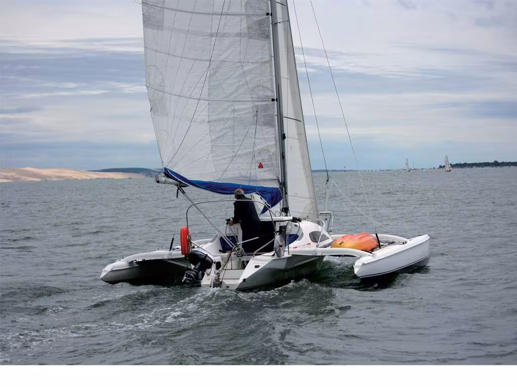 vent, tu vas à 12 ! Mon record, c'est 17 nœuds avec grand-voile haute et gennaker. Il y avait 21 nœuds de vent. On atteint ces vitesses sans s’en rendre compte tant le bateau est facile.". Alain Lemardeley, propriétaire depuis deux ans d’Entre deux mers, me met l’eau à la bouche avant même que les voiles ne soient hissées. Une formalité à bord d’un petit trimaran d’à peine plus de 7 mètres : la grand-voile toute lattée est envoyée à la volée, le foc déroulé, et hop, le speedo dépasse allègrement les 10 nœuds. Aussi simple que ça. Le tout bien à plat et presque sec !