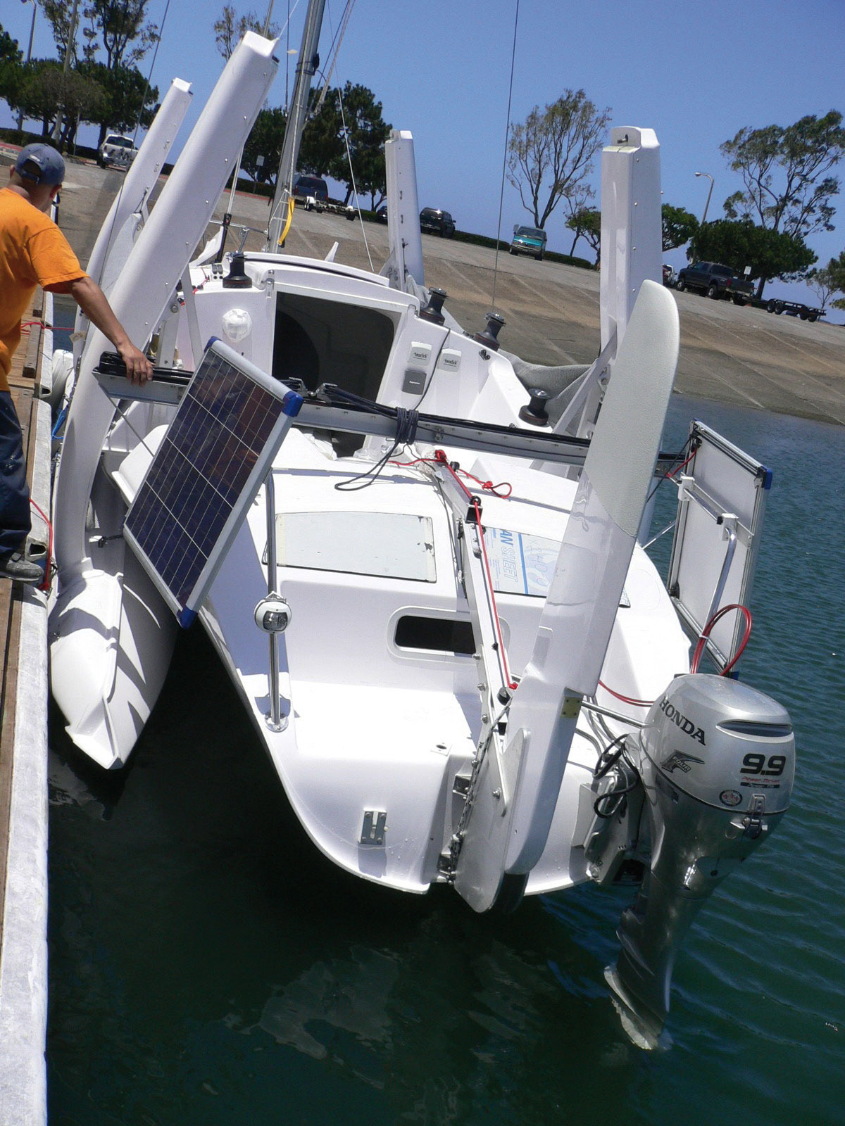 Etroite à la flottaison, la coque centrale du F-31 le reste également au pont, ce qui n’augure rien de bon quant au confort… le cockpit est donc tout en longueur. Le barreur dispose d’un grand stick pour s’installer sur le flotteur. Mais il est entravé par une imposante barre d’écoute. Pas si simple donc de manœuvrer en solitaire sans un bon pilote automatique à poste. La version CC, quant à elle, repousse la barre d’écoute au-dessus de la barre franche. A l’arrière, un évidement assure un accès « minimum » à l’eau ou l’annexe. Le rouf à teugue ne libère aucun passavant ; on enjambe les superstructures ou on emprunte les trampolines latéraux. Une fois que l’équipage s’est approprié les fameux filets, le F-31 devient beaucoup plus agréable à vivre – pour autant que les conditions et/ou le temps restent cléments. Le fameux système de repliage mis au point par Ian Farrier permet de passer de 6,84 m à 2,50 m ; le F-31 est donc transportable. A noter : lors des carénages, il est recommandé de gruter et de stocker le trimaran « déplié » pour conserver un bon accès aux œuvres vives.