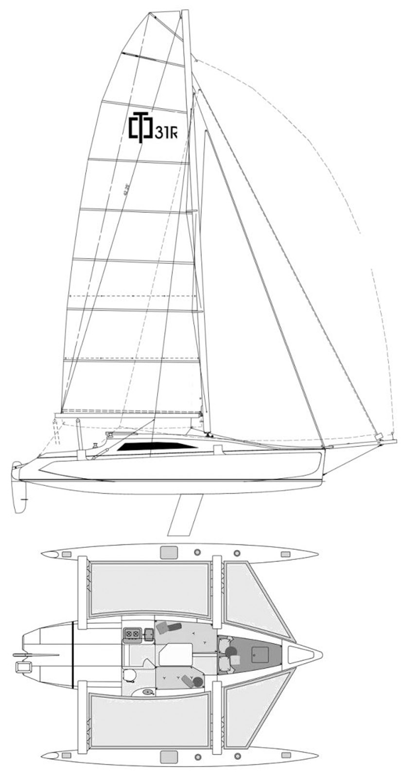 Voilà un trimaran qui n’a pas vieilli : son design reste toujours dans le coup, avec un rouf élégant et des carènes fines et racées. Ce modèle est une adaptation du F-9, destiné à la construction amateur. La réalisation de petits trimarans « at home » a toujours été très populaire en Australie – c’est toujours le cas aujourd’hui. Comme de nombreux modèles qui ont connu une longue carrière, le F-31 se décline sous de nombreuses versions. Les plus connues sont la C comme Cruising et la R comme Racing. Entre les deux, une différence de surface de voilure à même de donner des chevaux en plus par petit temps à la seconde. Quand Ian Farrier et Corsair ont pris des chemins différents, ce modèle a poursuivi sa carrière sous le vocable Corsair 31. Le modèle C devient CR, et la version R adopte le vocable RS. Un gréement carbone est proposé puis, plus tard, une série monotype (1D ou One Design). Corsair a également mis au point un cockpit central assorti d’une cabine arrière : il s’agit du modèle CC.