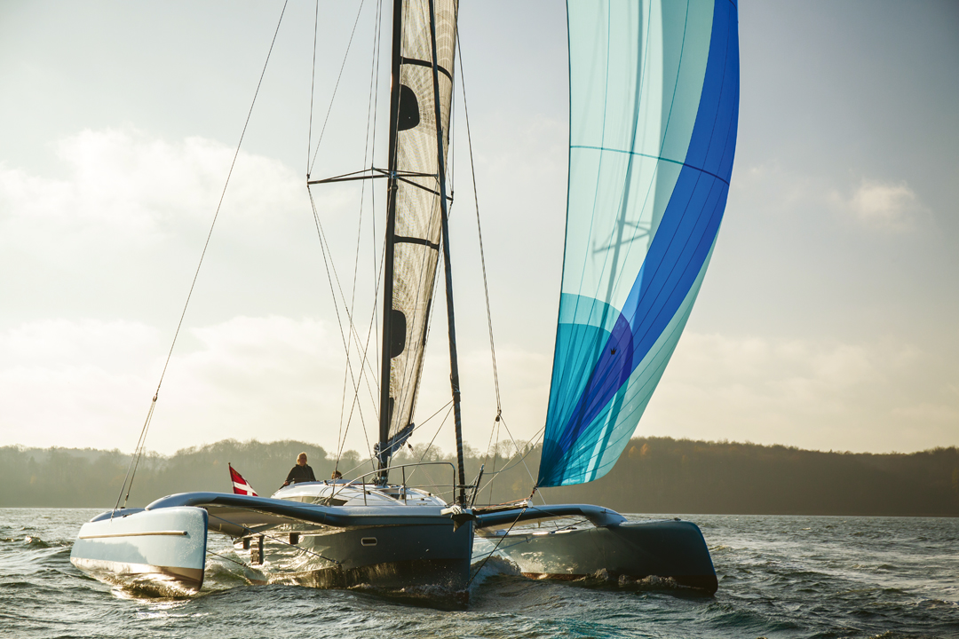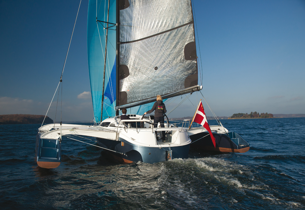 Aussitôt sortis de la marina construite spécialement pour le Salon International du Multicoque, nous déplions notre flotteur tribord en quelques secondes – le triamaran était amarré en prao durant le show. L’architecte du 32 Evolution, Jens Quorning, procède au réglage de la patte d'oie-bastaque pour le vent médium-top qui nous attend dehors. A la barre, je prends plaisir à retrouver une plate-forme que j'avais appréciée en Baltique en 2012. Le moteur ronronne sans vibration ni bruit de châssis ; ce petit diesel, avec sa puissance rassurante, sécurise parfaitement les manœuvres portuaires (avec l'aide précieuse du propulseur d'étrave), qui sont de courte durée avec cet engin. Une tramontane de beau temps (12-20 nœuds de NW dans le bassin W de la Méditerranée française) souffle sur la grande baie d'Aigues-Mortes, notre piste d'essai du jour. Jens a préparé le Code 0 signé Elvström Danemark. Grand-voile haute, nous démarrons tribord amure en direction de Sète dans le SW. Le bateau est déjà très évolutif, l'envoi du Code – en prenant soin d'abattre généreusement avant de relofer – nous donne la puissance que nous attendions, et la cavalcade blanche démarre. La barre sur colonne pivotante JFA est un vrai bonheur – pas sûr qu'elle soit indispensable, une question de goût personnel et de budget en comparaison de l'excellente barre franche. Je suis déjà sur mon petit nuage, festonnant au gré des risées entre 12 et 18 nœuds. Seul le guindant de Code 0 m'indique la limite à ne pas dépasser au lof, mais la puissance maxi est là. Les abattées dans les petites surventes permettent de savourer la précision de barre et le sentiment de sécurité offert par les gros flotteurs. Plus large, plus puissant mais aussi plus toilé, le 32 Evo n'est pas forcément plus rapide que la version précédente dans ces conditions, mais son look plus tendance, les œuvres vives plus tendues des flotteurs, les étraves wave-piercing et la réserve de flottabilité induite constituent un réel plus pour le passage en mer croisée ou la conduite "à la limite". Le plan de pont est parfaitement pensé, le ressenti de barre final sublime : quiconque n'a jamais barré ce genre de trimaran dans la brise ne peut se satisfaire de son CV nautique. Décidément, la vie commence à 20 nœuds ! Nous allons runner une grande partie de l'après-midi, interrompus seulement par un coup de pétole momentané de quelques minutes. Je soupçonne Eole de nous l'avoir envoyé pour mieux savourer la phase de redémarrage durant laquelle on passe de 0 à 15 nœuds en quelques minutes. Le bonheur de surfer sur une mer quasi plate sous la caresse d'une brise soutenue est intraduisible, le spray qui monte de l'étrave inversée est à l'unisson de mon plaisir personnel ; j'échangerais des semaines de croisière ordinaire contre quelques heures de fun de cette nature. Le châssis du 32 Evo est parfaitement réglé, pas un bruit de liaison, pas de grincement parasite ou de torsion perceptible. Après plusieurs heures de jeu nautique, nous nous retrouvons largement sous le vent de la baie et rentrons au près serré-serré en trois bordées. A cette allure, la nouvelle géométrie montre une nette supériorité. Le trimaran semble très à l'aise sous grand-voile haute et solent dans un vent apparent qui dépasse parfois les 30 nœuds. L'angle par rapport au vent est indécent, et peu de voiliers de plaisance pourraient faire jeu égal…