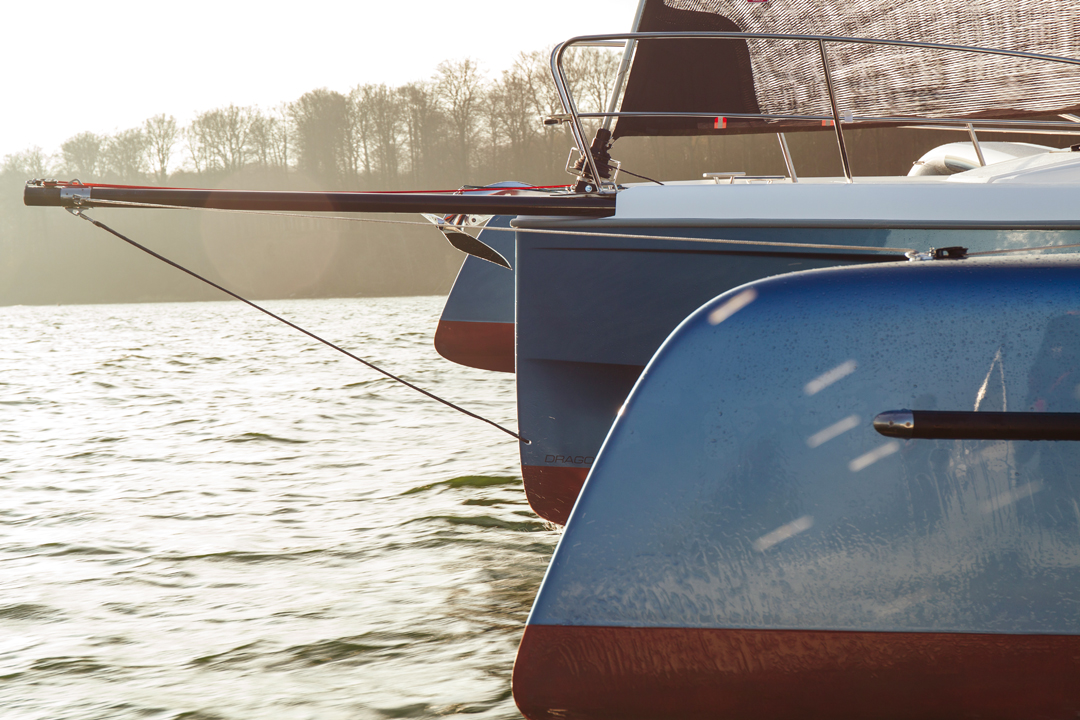 Le mode de repliage du Dragonfly 32, comme tous les autres modèles de la gamme, est confié à une cinématique de type horizontal, à l'inverse des Corsair, qui ont adopté le système de Ian Farrier à axe vertical. Cette mécanique de précision, qui met aussi en tension les trampolines, via un pouliage complexe, offre l'avantage d'un dépliage-repliage très pratique et rapide. Revers de la médaille, ce système impose pour un fonctionnement optimum une maintenance rigoureuse avec des changements de pièces d'usure (câbles water stays, axes, trampolines…) selon une périodicité précise donnée par le constructeur. Sur le 32, l'assistance d'un winch électrique fluidifie la manœuvre en la rendant plus rapide et aisée. L'habitude venant, le repliage prend moins d'une minute. En version Evolution, les flotteurs sont 50 cm plus longs et 20 % plus volumineux, surtout à l'arrière, mais, leurs axes de pivotement étant implantés plus en l'avant, la version Evo est plus courte en longueur hors tout repliée. Les marinas prendront donc en compte pour la facturation 11,89 m x 3,85 m. Ce qui vous coûtera certainement bien moins cher que les 9,90 m x 8,25 m en mode déplié…