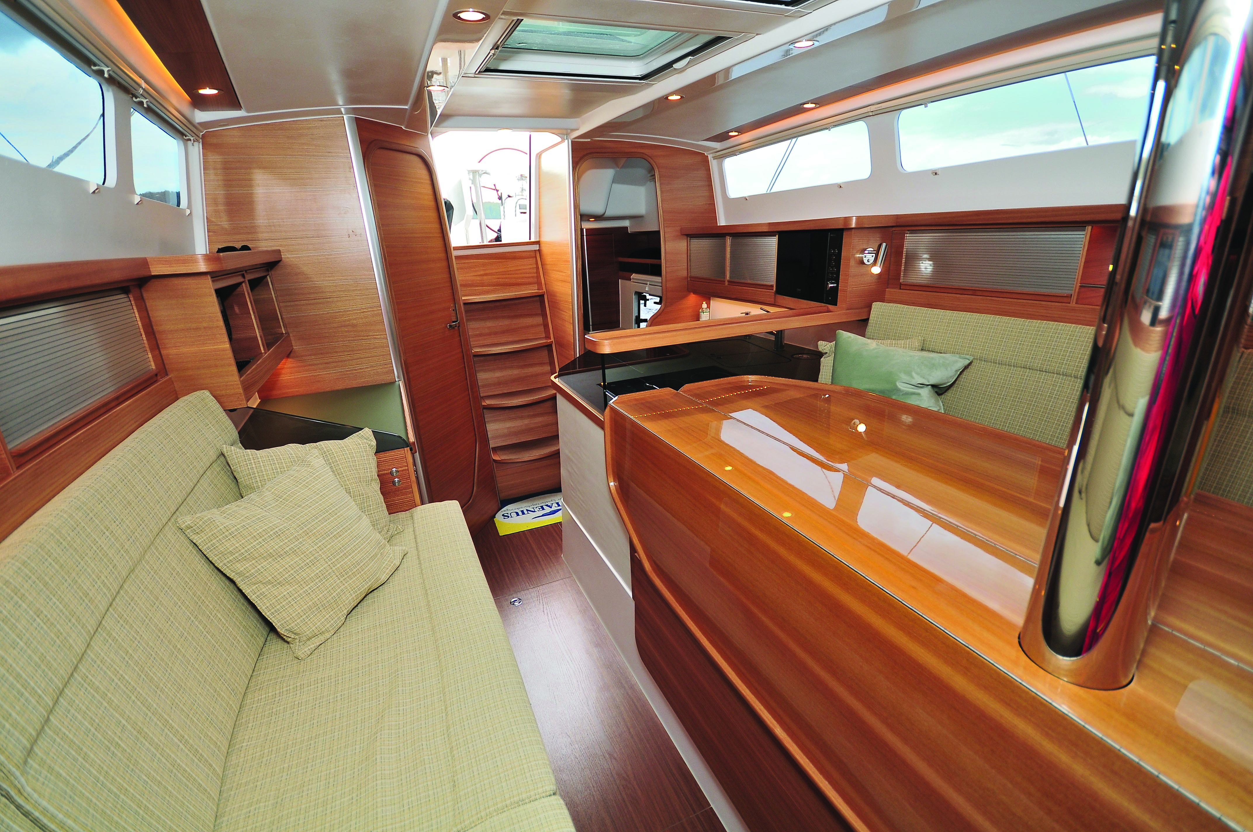 La maîtrise des formes et des matériaux par les ébénistes de Skaerbek trouve une fois de plus sa traduction dans cet intérieur magnifique. L’orme d’Amérique a avantageusement remplacé le teck – son veinage est plus lumineux. La matière plus chaude se prête parfaitement à l’aménagement du 40 pieds danois. La cuisine en L est complète et pratique, dotée d’une poubelle futée – mise à la mer directe des déchets organiques. Le bureau/table à cartes qui lui fait face accueille en partie haute le tableau de gestion électrique et un grand range-casseroles en bas. L’unique salle d’eau douche-WC est parfaitement maîtrisée : confort, espace, rangements et intimité garantis. La table centrale posée sur le puits de dérive accueille aisément six personnes. La lumière et la ventilation constituent un des points forts de ce trimaran. Les grands panneaux de pont flush sont tous dotés (en option) d’occultant et de moustiquaires coulissantes. La descente accueille le panneau de fermeture dans un logement dédié pendant la navigation de beau temps ainsi qu’un cadre-moustiquaire carbone coulissant. Ce dernier permet d’isoler l’intérieur tout en conservant une ventilation parfaite (idéal pour les fleuves ou la Baltique en été). La cabine arrière se déploie sous le cockpit. Sa configuration tatami (220 à 150 cm de large par 200 de long) permet de trouver une position de repos quel que soit l’état de la mer, d’autant que le centre de gravité très bas limite le ressenti des mouvements du multicoque. La hauteur sous barrot de 1,90 m dans le sas d’entrée autorise l’habillage dans de bonnes conditions (130 cm sous le cockpit). Cette cabine-chalet est unique par son atmosphère cosy. La cabine double à l’avant est également parfaitement indépendante, et bénéficie de la même qualité de lumière et de ventilation.