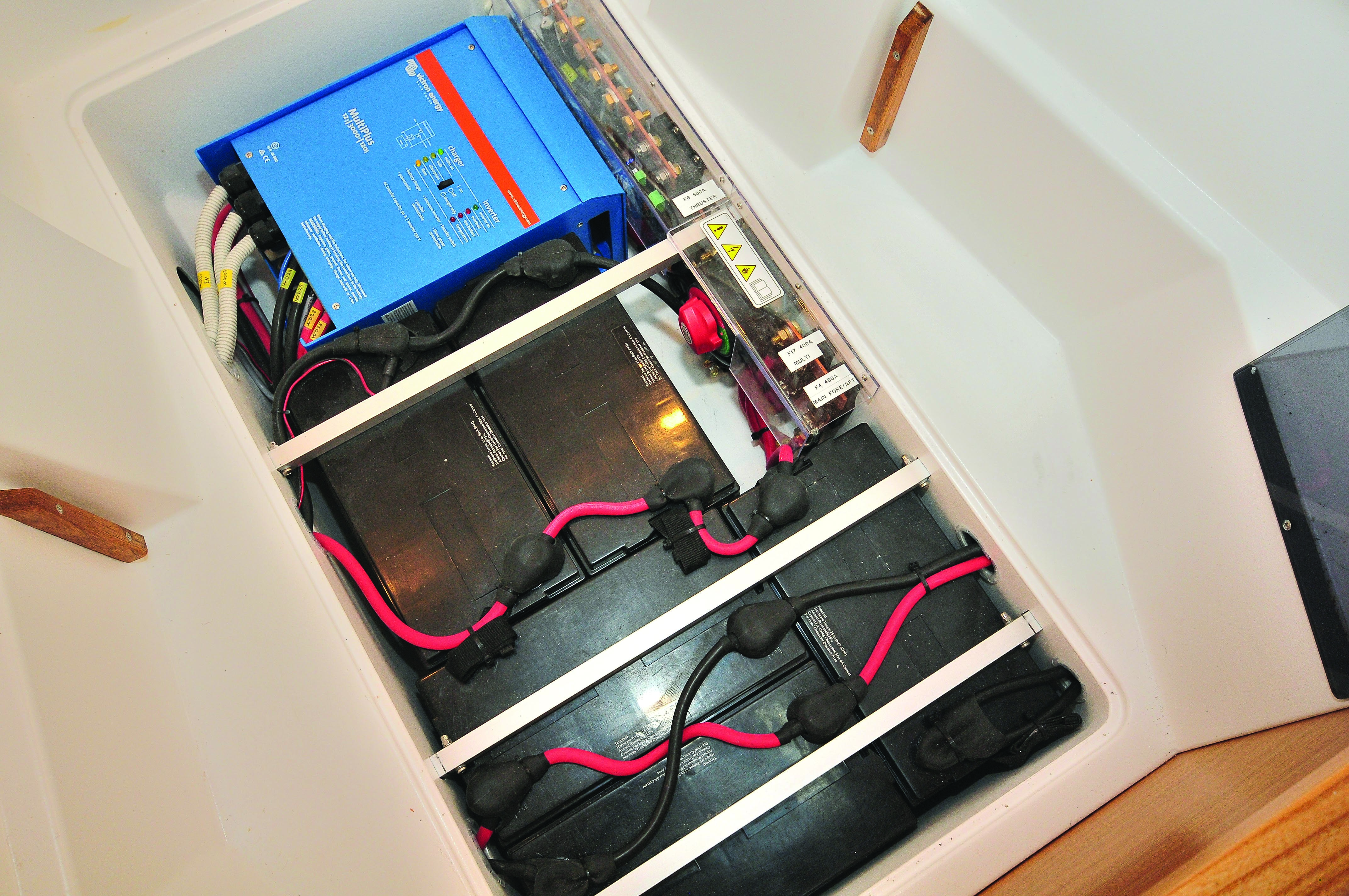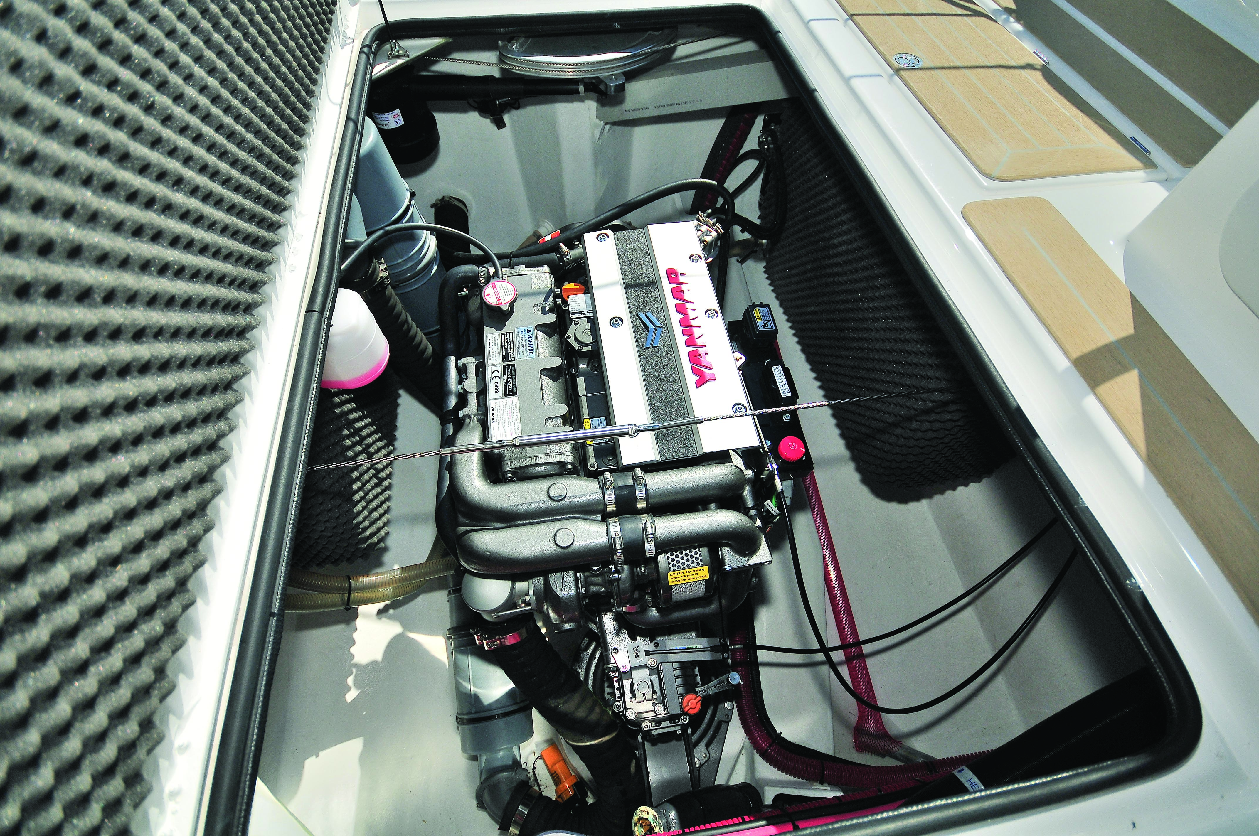 Le 40 CV Yanmar est une mécanique sobre, propre et discrète. Elle constitue un choix parfait pour ce trimaran, propulsé à plus de 9 nœuds en pointe (hélice tripale repliable Gori) et 8 nœuds en croisière. La transmission sail drive limite l’encombrement sans empêcher l’échouage sur le creux de coque. La cale moteur est généreuse ; elle abrite l’installation pilote connectée directement sur le bras de mèche. L’accès aux transmissions par câbles est parfait.