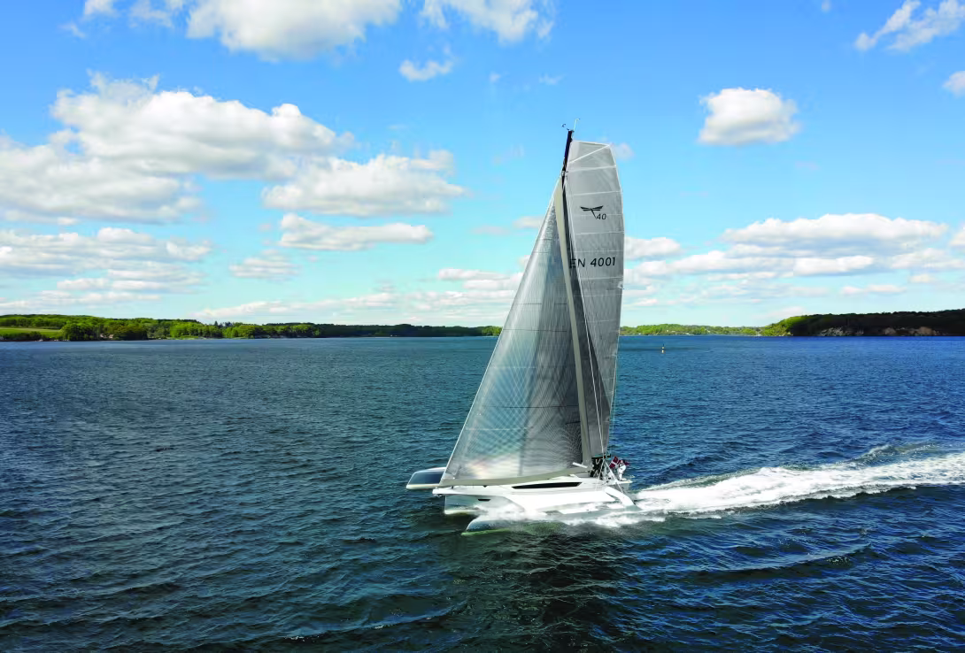 Le constructeur danois Quorning Boats avait déjà produit le Dragonfly 12 M, un grand modèle confidentiel de 40 pieds ; après 16 exemplaires, la fabrication de ce trimaran luxueux a été interrompue lors de la refonte complète de la gamme. Le DF40 devient aujourd’hui le Flagship du chantier de Skaerbek : sa définition est très différente du 12 M, son ambition de diffusion également (4 à 5 unités par an). La silhouette et le design intérieur sont plus modernes, les performances sont revues à la hausse et l’ergonomie de manœuvre totalement revisitée. Nous avons pu l’essayer quelques mois après son unique présentation au boot Düsseldorf 2020.