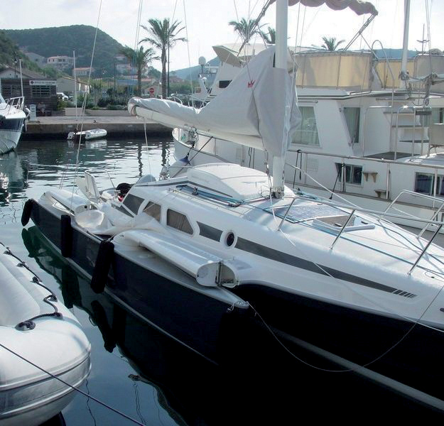 Lorsqu’on quitte le port, le dépliage des bras s’effectue en embraquant une bosse au winch et en verrouillant les waterstays. L’opération se fait sans effort et en deux minutes. Mais c’est dès les premières encablures que le sourire se fixe définitivement sur votre visage. Avec dix nœuds de vent, vous pouvez voguer à 7-8 nœuds au près, et plus en débridant. Entre 15 et 20 nœuds de vent, vous passez systématiquement la barre des 10 nœuds, et, au-delà des 20 nœuds, ayant bien réduit la toile, vous pourrez compter sur une vitesse quasi constante de 15 nœuds. Dans tous les cas de figure, le rayon de votre programme côtier s’en voit considérablement agrandi. Son poids, relativement élevé pour ce type de bateau, et son architecture lui procurent des mouvements doux, et la mise au point de ses manœuvres donne la possibilité à des novices (après quelques leçons, tout de même) d’exploiter facilement le potentiel de ce trimaran qui au final se révèle ludique pour qui veut s’introniser au trimaran.