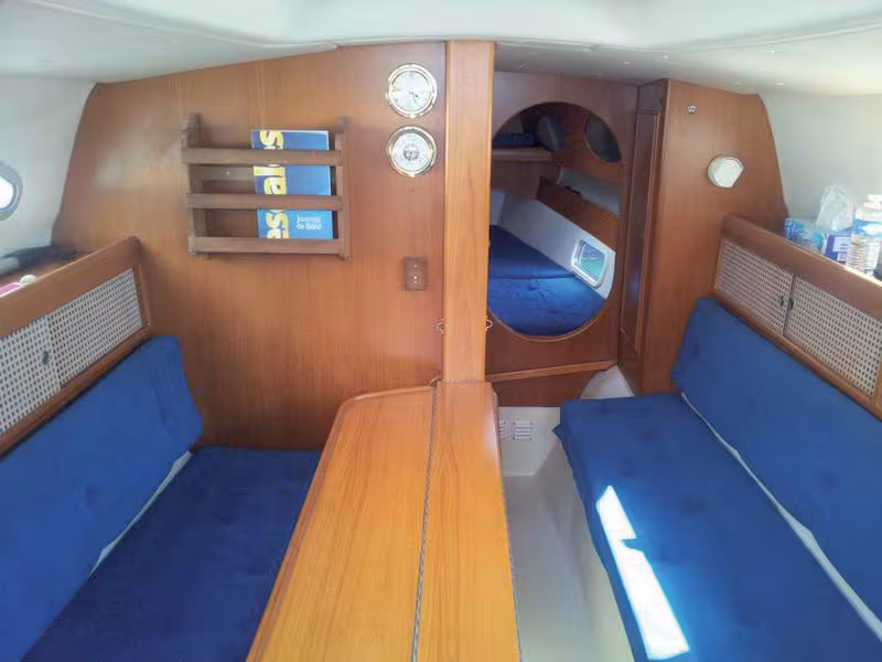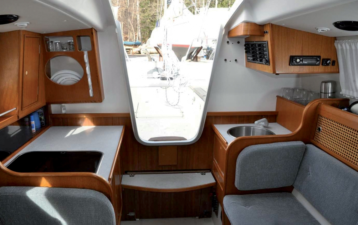 L’engouement pour le 920 provient de ses aménagements pour 4 personnes et de son rapport habitabilité/performance/confort. A bord, on retrouve les standards en vigueur en monocoque de même taille, pourvu de toutes les fonctions essentielles mais en légèrement plus petit : en entrant à tribord, cuisine avec évier et deux feux, à bâbord, selon la version, placard à ciré ou mini table à cartes (idéal aujourd’hui pour nos iPad, comme l’évolution est bien faite), les banquettes du carré se transforment en couchette de 70 cm de large de part et d’autre du puits de dérive qui soutient la table ; vers l’avant, un cabinet de toilette fermé fait face à une penderie, la cabine avant en alcôve dispose d’une couchette en V assez large pour un tri de cette taille, car les sections avant de la coque sont assez volumineuses. La hauteur sous barrot de 1,78 m à l’entrée mais de seulement 1,54 m vers l’avant peut cependant sembler exiguë aujourd'hui. Mais la bonne ergonomie et l’ambiance chaleureuse et rassurante du teck, utilisé à profusion pour les cloisons et meubles, ainsi que le velours des assises, fidèle à l’image que l’on se fait des plus prestigieux fabricants de la Baltique, concourent à un confort douillet. Les rangements sont astucieux comme les battants des équipés en canevas ajouré. Autre particularité scandinave : il est toujours possible de s’équiper d’une tente de cockpit, venant prolonger la capote, et de profiter du carré terrasse extérieur. Le tout est bien fini et inspire une confiance et une autonomie suffisantes pour envisager de belles croisières en famille.