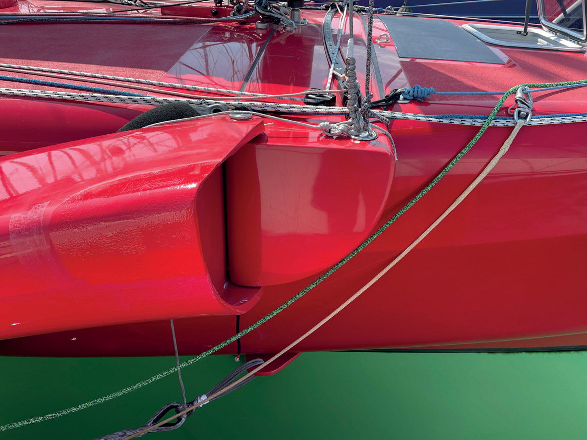 En 2019, nous écrivions que le 853 à bras fixes était beau et que ses formes bodybuildées provoquaient une séduction immédiate. Contre toute attente, quatre ans plus tard, l’émotion est identique avec la version repliable, ce qui est une gageure ! En effet la cinématique de repliage dévoile la physiologie des attaches d’un trimaran qui, au ponton, n’est pas toujours des plus gracieuses. Sur le Libertist, les ancrages des bras crossés sur les plateaux de rotation des flotteurs et les charnières composites de la coque centrale sont magnifiques, la matière utilisée (carbone-époxy) et l’habileté des ouvriers du chantier permettent ces formes audacieuses et le respect de proportions élégantes. La peinture polyuréthane bi-composant rouge écarlate est irréprochable ; sa qualité d’application ne laisserait aucune place aux défauts d’aspect, ce qui tombe bien car il n’y en a pas !