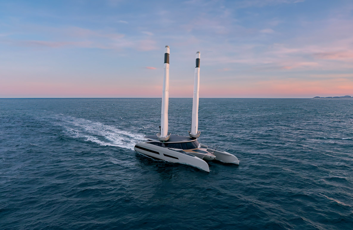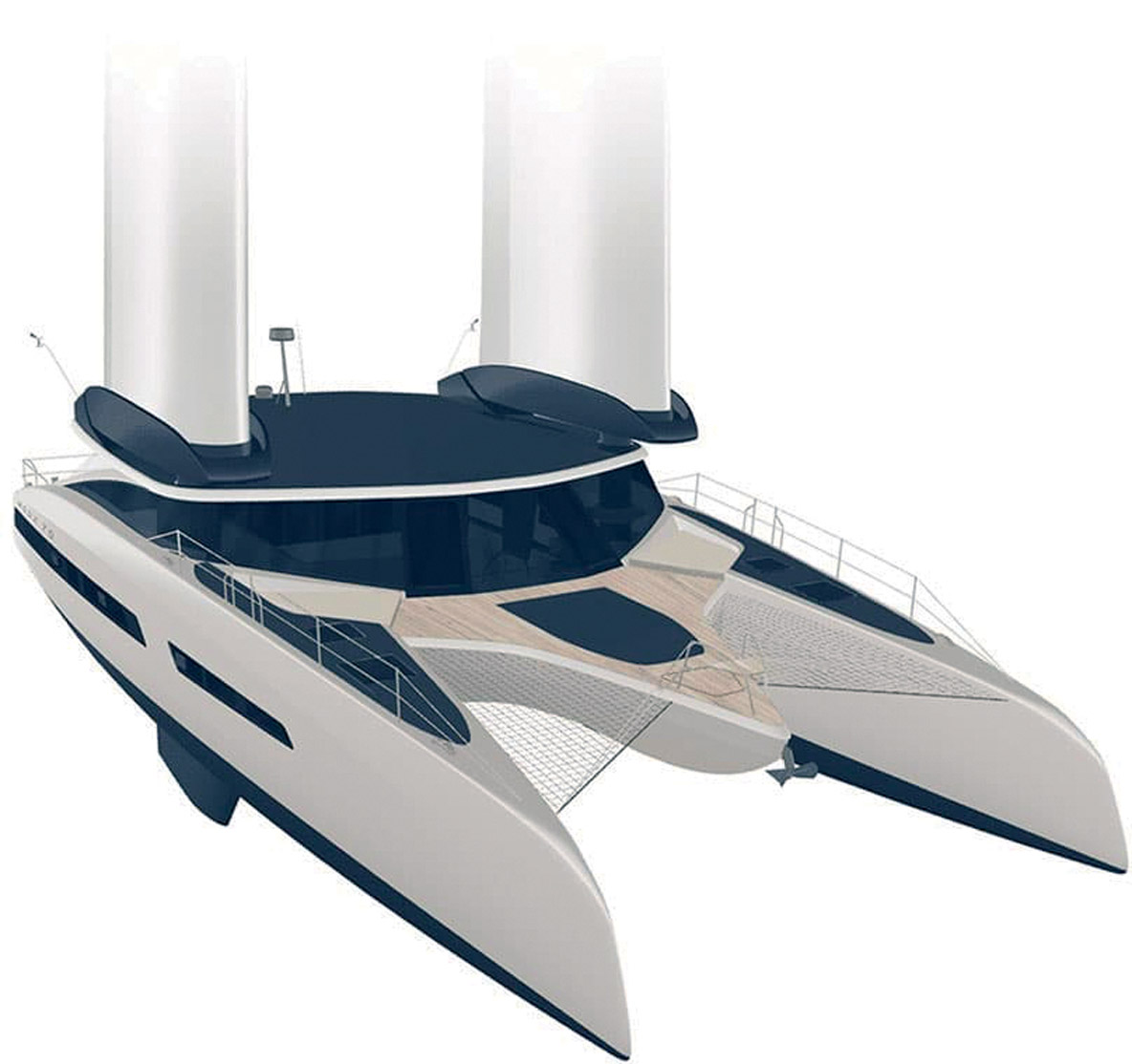 L’implantation s’inspire du système du yacht de 289 pieds Maltese Falcon avec paliers JP3 haut et bas, permettant la rotation à 360 degrés contrôlée par une chaîne sur moteur électrique. Les six tronçons de 4,50 m en carbone sont hissés à l’aide d’un treuil électrique, et les ailes, en membrane Drop Stitch (la même que celle de votre paddle !), sont gonflées à 0,1 bar par un compresseur de 2,5 kW. Les six wishbones en carbone qui forment le profil de l’aile et les membranes de l’enveloppe reposent sur un balestron, dont le tirant d’air varie entre 4,60 et 23 m. La propulsion électrique est assurée par deux moteurs Smart Gyro de 40 kW montés sur ligne d’arbre. Des hélices à pas variable ont été spécialement développées pour optimiser l’hydrogénération : un angle de 12° à 15° est donné en fonction de la vitesse. Théoriquement, le parc batterie de 250 kWh réparti dans chaque coque autorise une autonomie au moteur de 110 milles à six nœuds, mais la performance « sous aile » (et non pas sous voile donc) a été privilégiée pour ne pas recourir trop longtemps aux moteurs. La priorité est à l’inverse de générer du courant, car la consommation du bord est estimée entre 30 et 45 kWh par jour. Ces besoins en énergie sont cependant optimisés en se passant de climatisation sur le pont principal – très aéré par des sabords frontaux.