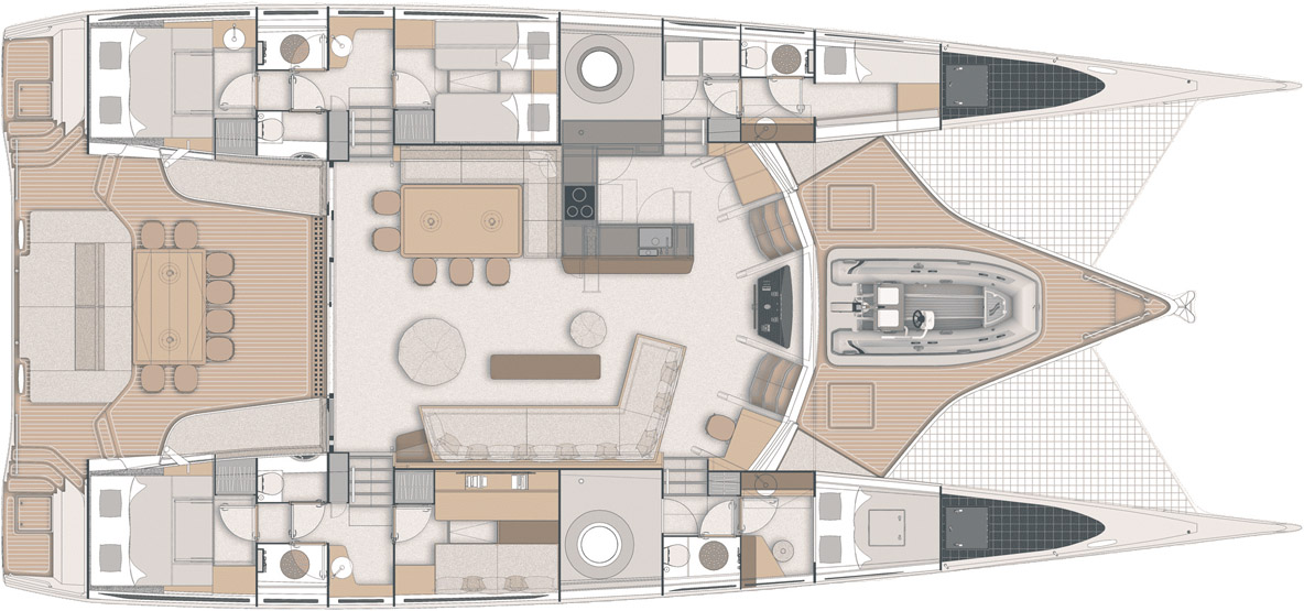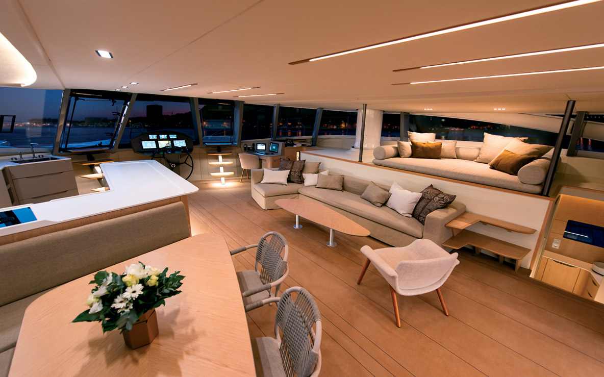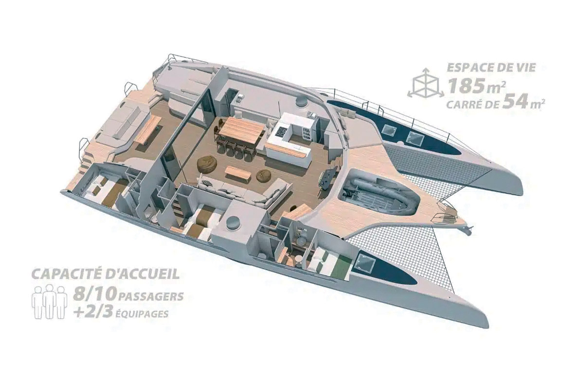 L’ouverture du cockpit est intégrale sur l’immense carré composé du coin repas, du canapé face à la cuisine américaine, et même d’un sofa en hauteur qui bénéficie d’une vue imprenable. Le pont est recouvert de teck synthétique au design très moderne. On compte quatre cabines pour les invités, dont deux avec des lits modulables en lits jumeaux. Les volumes offrent un gabarit comparable à celui d’un catamaran de croisière de grande série de 45 pieds – en raison de l’étroitesse des coques. Quant aux couchages, ils ne disposent pas d’accès en îlot, mis à part une découpe extérieure à l’arrière. En revanche, un vrai quartier d’équipage prévu pour trois ou quatre marins assure l’intimité et l’efficacité du service. Le choix du mobilier, réalisé par Nautimob, est très convaincant.