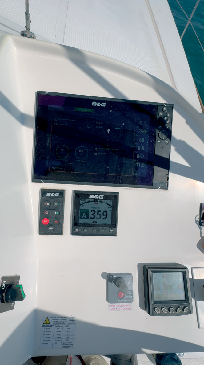 Sous voile seule, les conditions n’étaient pas propices à un vrai test, mais l’absence de bruit permettait de percevoir chaque risée, chaque changement d’assiette du bateau. C’est aussi un excellent outil pédagogique pour des croisières en famille ou entre amis : on écoute, on ressent, on comprend ce qui se passe à bord.