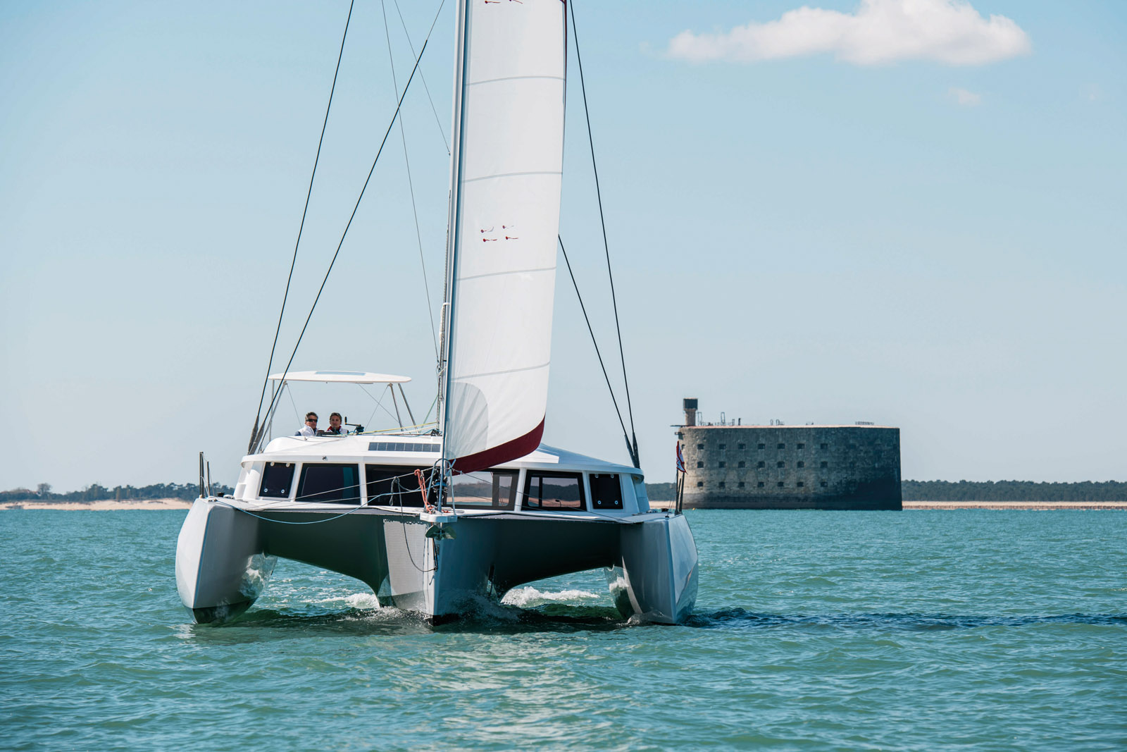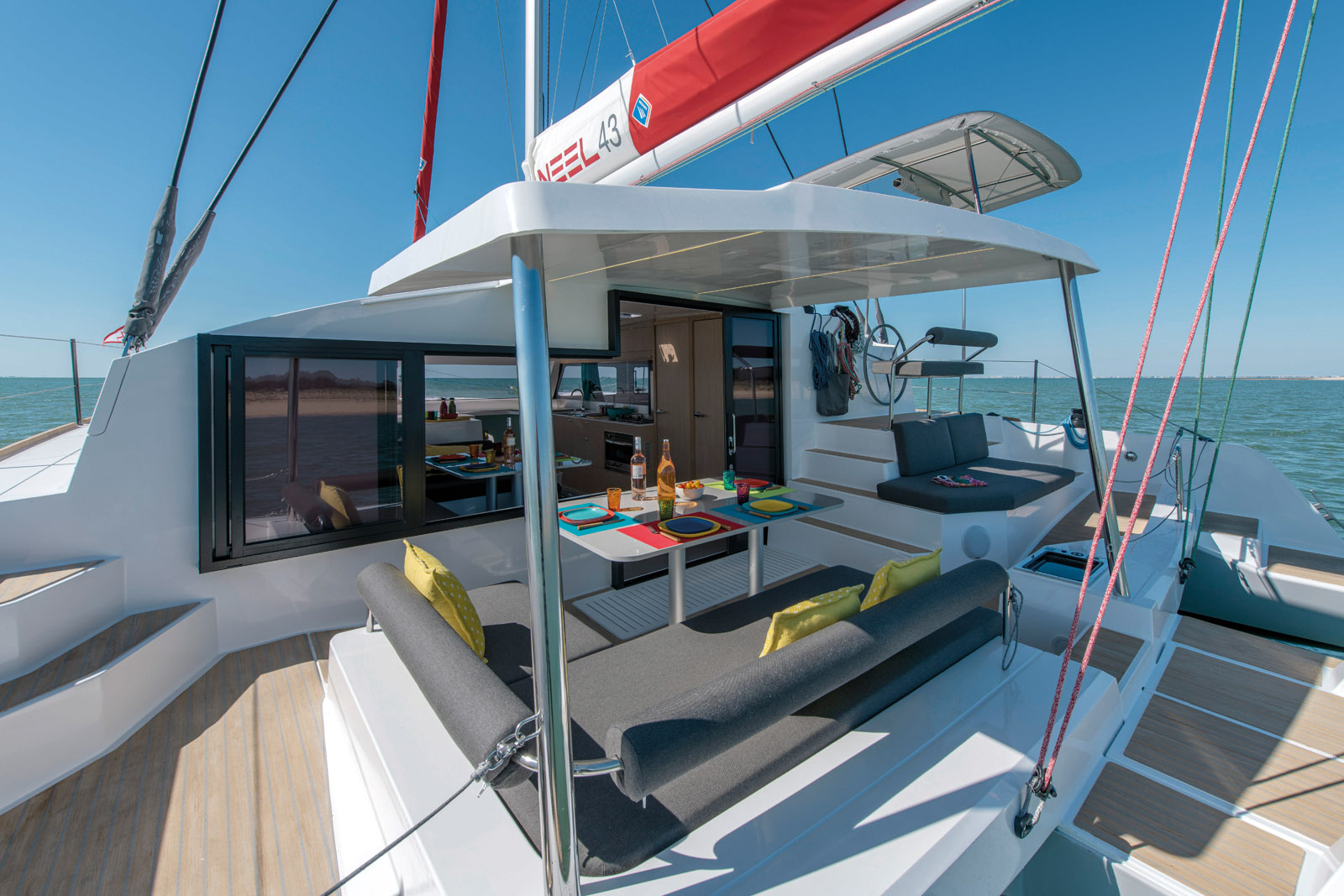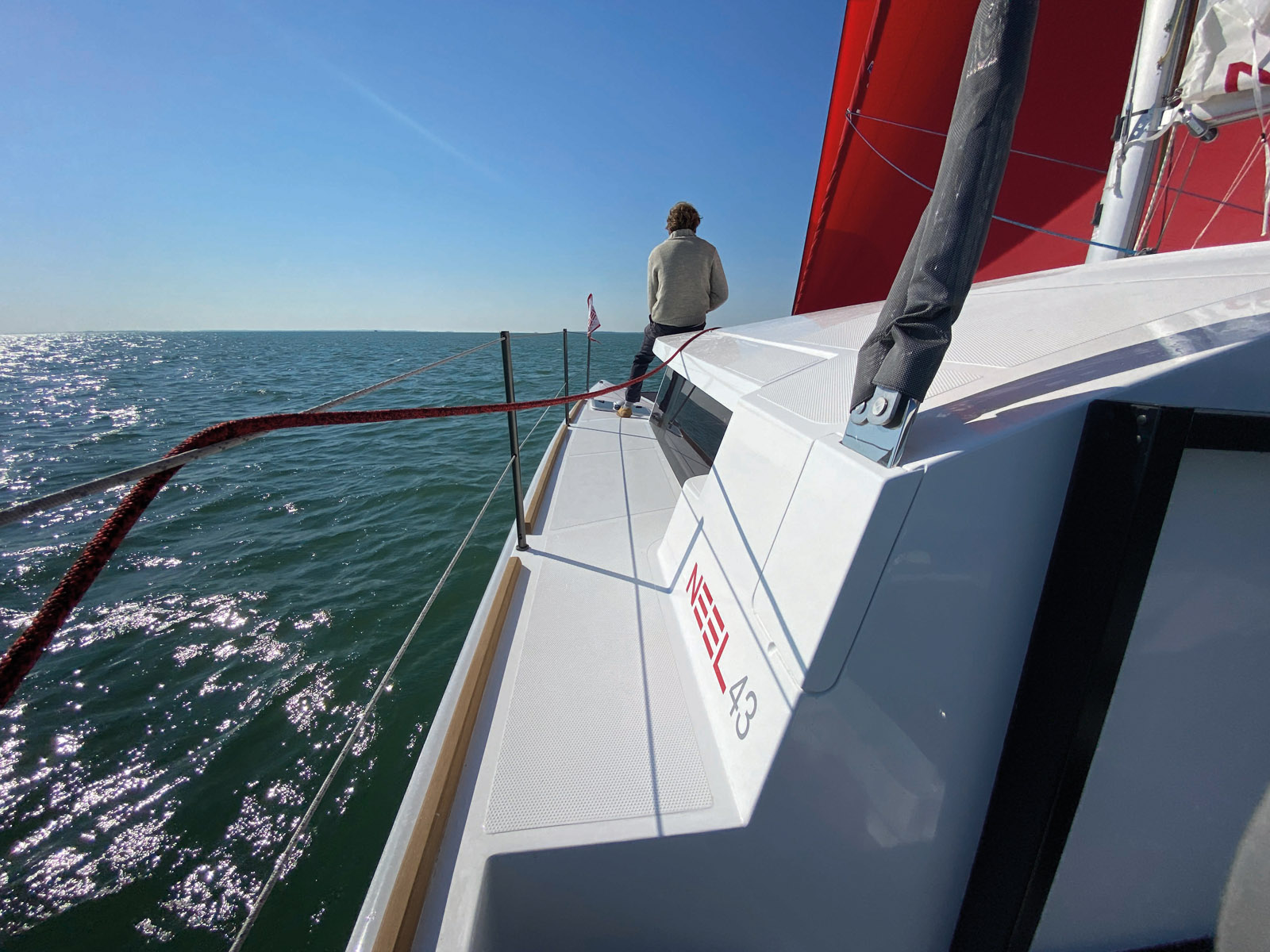 Habillé aux couleurs de son chantier – blanc et rouge –, Eric Bruneel ne boude pas son plaisir quand il s’agit de passer la barre ; il attend que vous savouriez les sensations avant de vous détailler plus encore son dernier-né. Je reconnais que ce sont les moments que j’ai passé à la barre qui m’ont le plus marqué lors de cet essai. La barre à roue est en prise directe avec l’unique safran de la coque centrale. Le ressenti est à la fois une douceur de barre franchement étonnante et un contrôle irréprochable de la trajectoire. Ajoutée à une gîte de 8 à 10° par bonne brise du près au travers, la sensation se rapproche de celle d’un monocoque ; on n’a pas du tout envie d’appuyer sur « AUTO » de la commande du pilote automatique, mais bien de placer parfaitement les penons du génois, pour accélérer encore… Nous voilà donc très loin des barres un peu « camion » de nombreux catamarans de croisière. Jusqu’alors, les fines barres qui ont longtemps régaté à bord de monocoques affûtés comme des J-Boats ou autres X-Yachts faisaient un peu une croix sur leur plaisir de naviguer – au tour de la famille de profiter de la vraie croisière, en multicoque bien sûr ! Le NEEL 43, lui, ravira ces anciens propriétaires – surtout les plus exigeants - de monocoques fins à la barre. Pour ne rien gâter, la banquette de 1,20 m permet à trois personnes de s’asseoir.