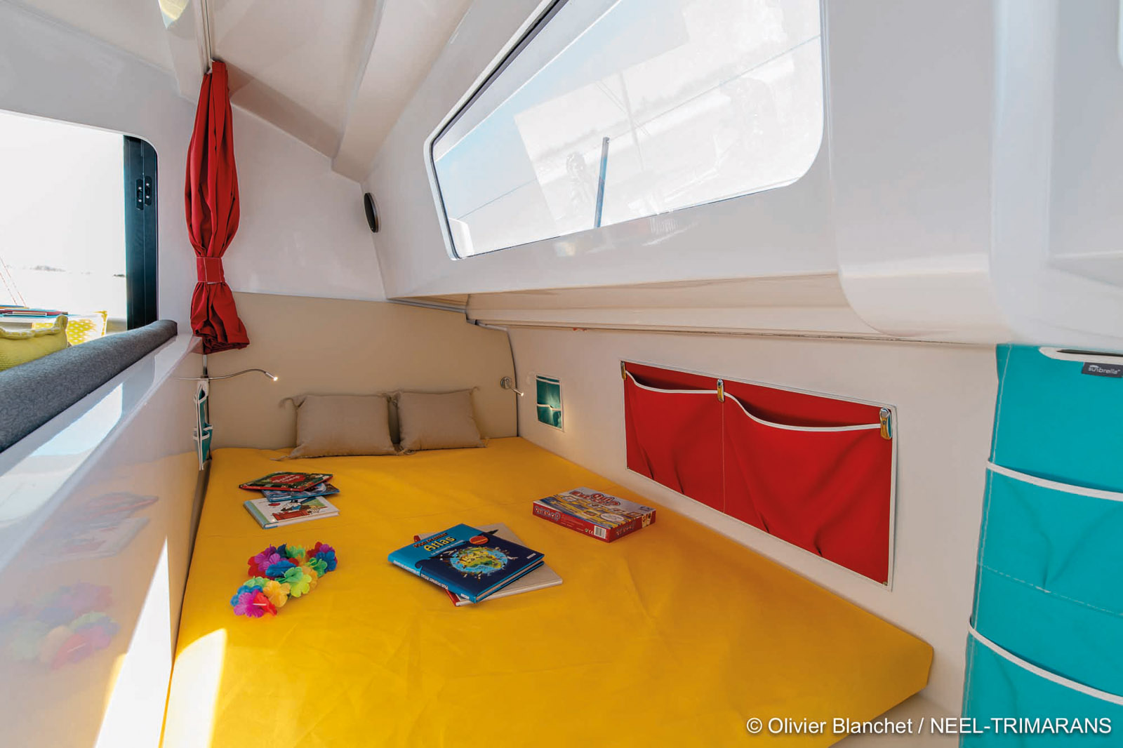 Au fil des modèles, la conception des aménagements des NEEL a évolué. C’est particulièrement flagrant à bord du 43, où l’impression de volume est saisissante quand on pénètre dans la nacelle – nous verrons plus loin pourquoi. Le constructeur a bien sûr retenu son concept « cockloon » – mix des vocables cockpit et saloon – pour gommer la frontière entre extérieur et intérieur. De fait, la grande porte vitrée de 1,87 m par 0,95 est accompagnée d’une seconde ouverture latérale coulissante de 95 cm par 70. Les deux tables – celle de l’extérieur et celle du carré de 110 cm par 90 – sont très précisément alignées, tout comme les assises. On a donc bien l’impression d’être à la fois à l’intérieur et dehors. La hauteur sous barrot est dans la nacelle de 1,97 m. L’impression de volume et la vue panoramique sont assurées par l’absence de cloison à bâbord et les grands vitrages sur tribord. Certes, les cabines concernées sont a priori moins intimistes comparées à celles d’un catamaran conventionnel de 43 pieds, casées dans les coins. Mais c’est ici un parti pris qui correspond à un usage familial ou à des amis qui se connaissent bien. Dans cette même logique, on ne compte qu’un seul cabinet de toilette/douche. Précisons qu’il est grand… La finition est très simple, un peu dans l’esprit des premiers Fountaine Pajot, mais plus colorée. Rien d’étonnant quand on sait qu’Eric Bruneel a passé la plus grande partie de sa carrière chez le grand constructeur français – il a même conçu des modèles qui portent eux aussi pour partie son nom, les Corneel… A quelques détails près, comme le revêtement un peu lâche qui couvre l’épontille et quelques angles trop vifs, on y verra les avantages d’un bon vieillissement et d’un entretien aisé plutôt qu’un quelconque inconfort. Un jugement qui reste mon point de vue, d’aucuns sont sensibles aux belles menuiseries, évidemment absentes ici. La cuisine, relativement compacte, se cale à tribord. Un poste de veille est installé face à la route. Les rangements sont nombreux. La cabine Propriétaire est la seule à disposer d’une porte classique. L’ouverture est relativement étroite – 40 cm –, mais le lit est grand – 1,50 m x 2. La vue sur l’eau est saisissante. Pour s’isoler du carré, il suffit de tirer les rideaux. L’aération est assurée par un panneau ouvrant. La deuxième cabine « qui ferme » est celle de la coque centrale. C’est d’ailleurs un capot complet sur glissière qui s’en charge. Des marches en quinconce – un pas japonais – mène à un couchage de 2 m de long, 1,30 m de large à la tête et 0,70 m aux pieds. Un capot ouvrant est prévu. La troisième cabine, à bâbord, est complètement ouverte sur le carré. Elle s’isole juste avec des rideaux. Le couchage de 2 m par 1,40 m, véritable tatami, sera l’emplacement idéal pour de jeunes enfants. Si le NEEL 43 affiche trois couchages doubles, sa capacité totale peut être portée à 10 personnes, puisque le constructeur propose, en option, d’aménager les pointes avant des flotteurs en couchette simple et de disposer d’un carré-dînette transformable en couchette double.