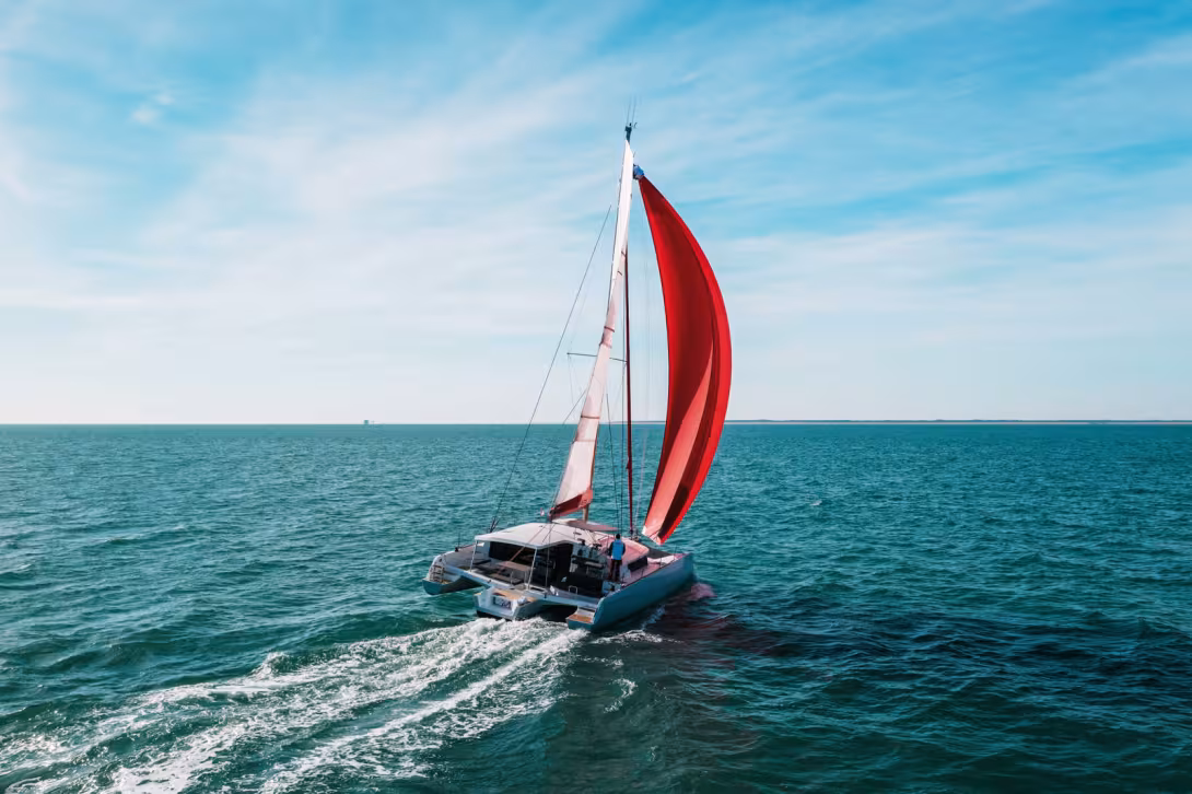 Par bonne brise, le flotteur au vent finit par sortir complètement de l’eau. Celui sous le vent s’enfonce un peu, jusqu’à une gîte maximum de 10°.
