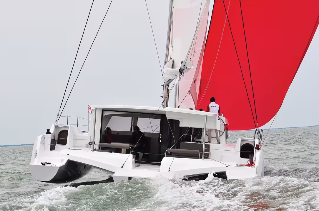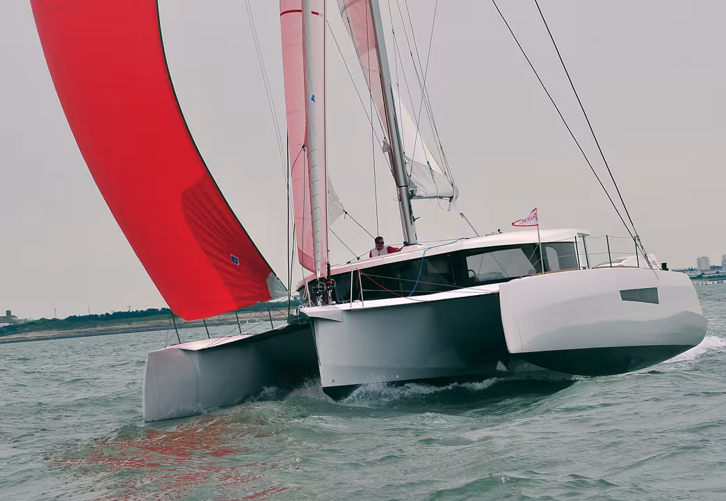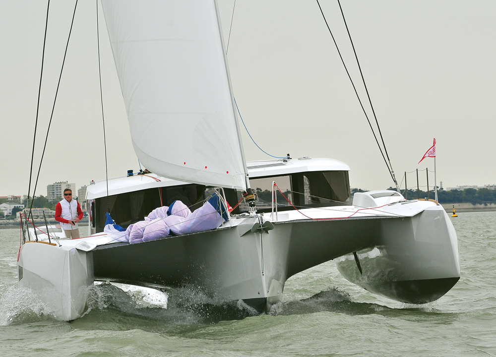 Avec ce cinquième modèle, le constructeur démontre qu'il dispose désormais de la capacité à proposer un multicoque au cahier des charges très ciblé. Le 47 s'adresse en effet à des futurs propriétaires voyageurs qui vont pratiquer la grande randonnée en équipage réduit - ce qui signifie, la plupart du temps, en couple – tout en conservant la possibilité d'accueillir à l'escale enfants ou amis sans perdre leurs repères d'intimité. Eric Bruneel et son équipe ont repensé l'aménagement intérieur de la coque centrale pour en faire un espace de vie et de navigation totalement orienté vers cet usage.