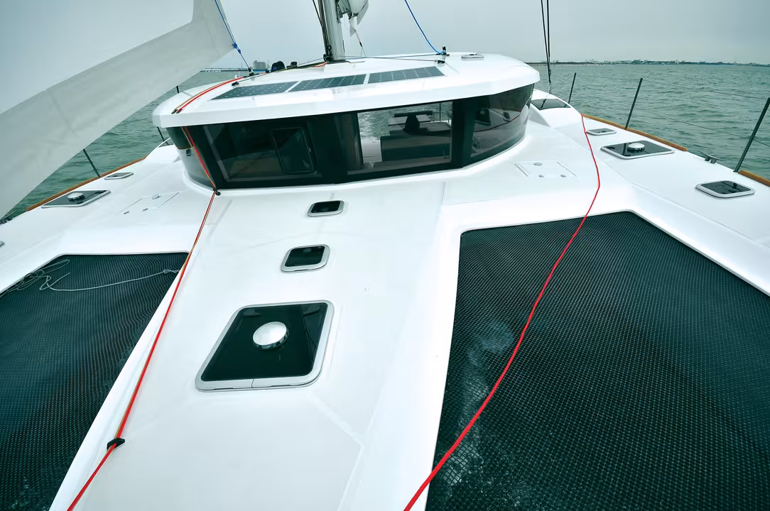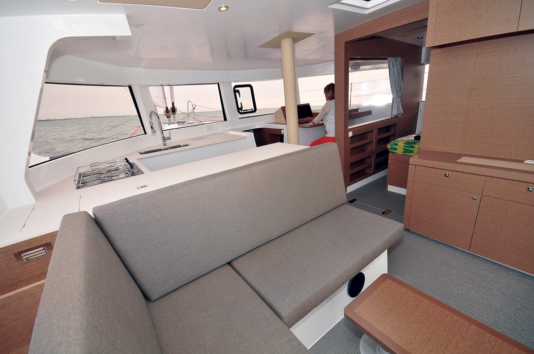 L'organisation innovante de la nacelle est la marque distinctive du 47 ; en navigation, tout se passe ici, et le couple de navigateurs ne se disperse pas aux extrémités des coques. Meilleure vigilance et économie d'énergie peuvent faire la différence dans des conditions délicates. Le cockpit est vaste : il peut aussi accueillir une joyeuse bande à l'happy hour. Cet espace est modulable : cette terrasse nautique au mouillage passe du patio au salon extérieur toutes saisons grâce à un jeu de cloisons textiles. En mer, on pourra choisir d'y dîner par beau temps ou rejoindre le carré intérieur - les tables sont mobiles. En cuisine, le "chef" dispose d'un vaste plan de travail en U très ergonomique et assure une veille efficace depuis ce bow-window marin ; il reste en contact intime avec son plan de voilure. La table à cartes – ou plus précisément le bureau de navigation – est mitoyenne avec une belle vision semi-panoramique. Le 47 va encore plus loin à la rencontre des attentes des navigateurs (trices) en leur permettant d'effectuer le quart diurne ou nocturne depuis… leur lit ! La cabine propriétaire est en effet totalement ouverte sur l'environnement marin sur les côtés et vers l'avant. Une cloison mobile et des rideaux occultants permettent de s'isoler à la demande.