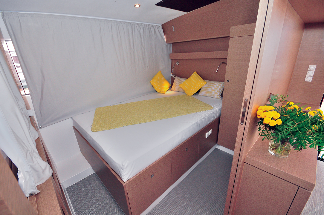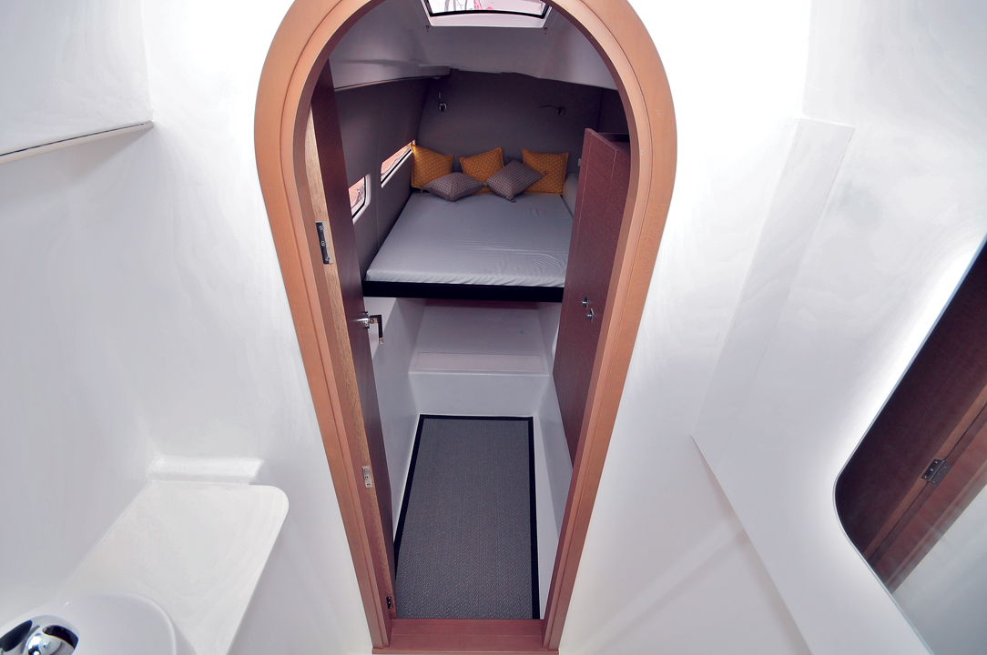 Autre arbitrage sans compromis, la séparation des cabines invités et l'absence de communication interne avec les flotteurs. L'entrée dans cet espace privatif s'effectue par un capot de descente coulissant et trois marches escamotables. On découvre alors dans le cabinet de toilette - lequel peut être équipé d'un WC. Voilà l'endroit idéal pour se dévêtir de son ciré. En franchissant la porte de séparation, on accède à une cabine confortable (lit de 140 cm de largeur), bien éclairée, ventilée et disposant de sa propre penderie. J'apprécie cette organisation de l'espace, innovante, rationnelle et pertinente.