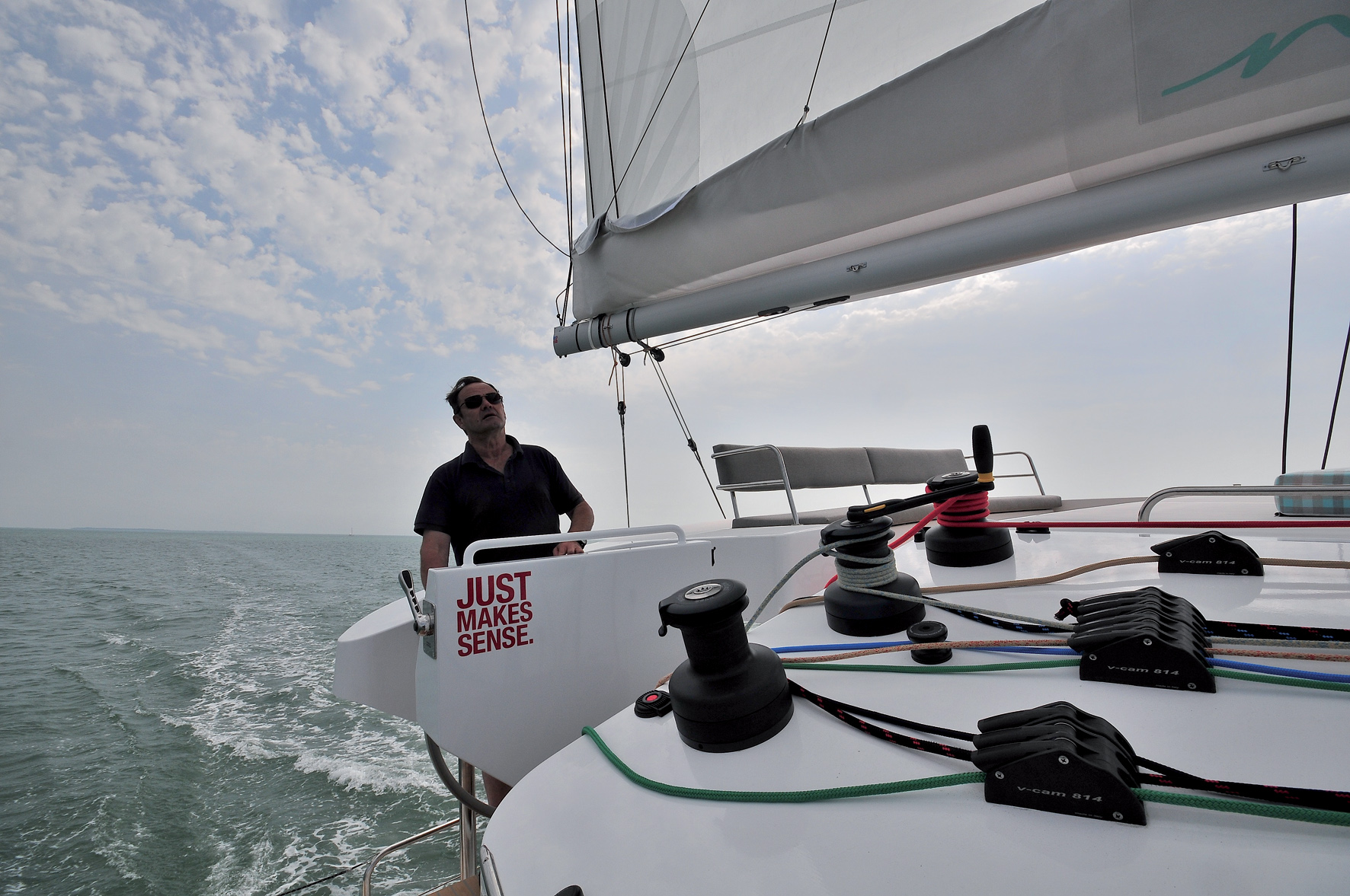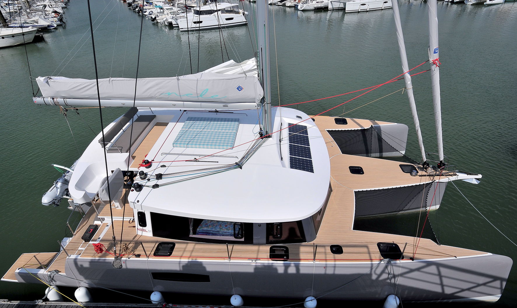 La cloison mobile (3 corps) s’escamote sur le côté tribord, découvrant une perspective unique dans cette taille. Un des éléments de la table bicorps est installé sur un pied télescopique et peut se transformer en un tatami de voyage sensationnel. 10 convives s’installent confortablement dans cette loggia-salle à manger. La cuisine est énorme ! Elle fera le bonheur de tous les Bocuse zigzagodromiques ; qu’on me confie cette installation avec vue et, promis, je ne toucherai plus à un seul bout sur le pont. Ce "piano" est si séduisant qu’il sera impossible à quiconque de se plaindre de la fameuse corvée de cuisine ! Le bureau de navigation est lui aussi remarquable, grand, intelligemment aménagé, sa position frontale en fait un poste de veille formidable à l’écart de l’animation du bord. La cabine padronale, logée dans la nacelle à tribord, reprend les codes Neel, avec une vue panoramique transversale exceptionnelle. La cabine avant (avec son cabinet de toilette privatif) dévoile également un bel espace intime, séparé de la circulation générale. Les cabines de flotteurs (optionnelles) ressemblent beaucoup aux déclinaisons tendance des versions propriétaires de catamarans de 40’ ! Elles offrent salles d’eau et WC en pointes, de confortables lits doubles à l’arrière et tout le rangement souhaitable en coursive. Incroyable ! La menuiserie Alpi est soignée, les ajustages précis ; les lignes de fuite et le style général urbain chic sont soutenus par des vaigrages et une sellerie maison de belle facture.