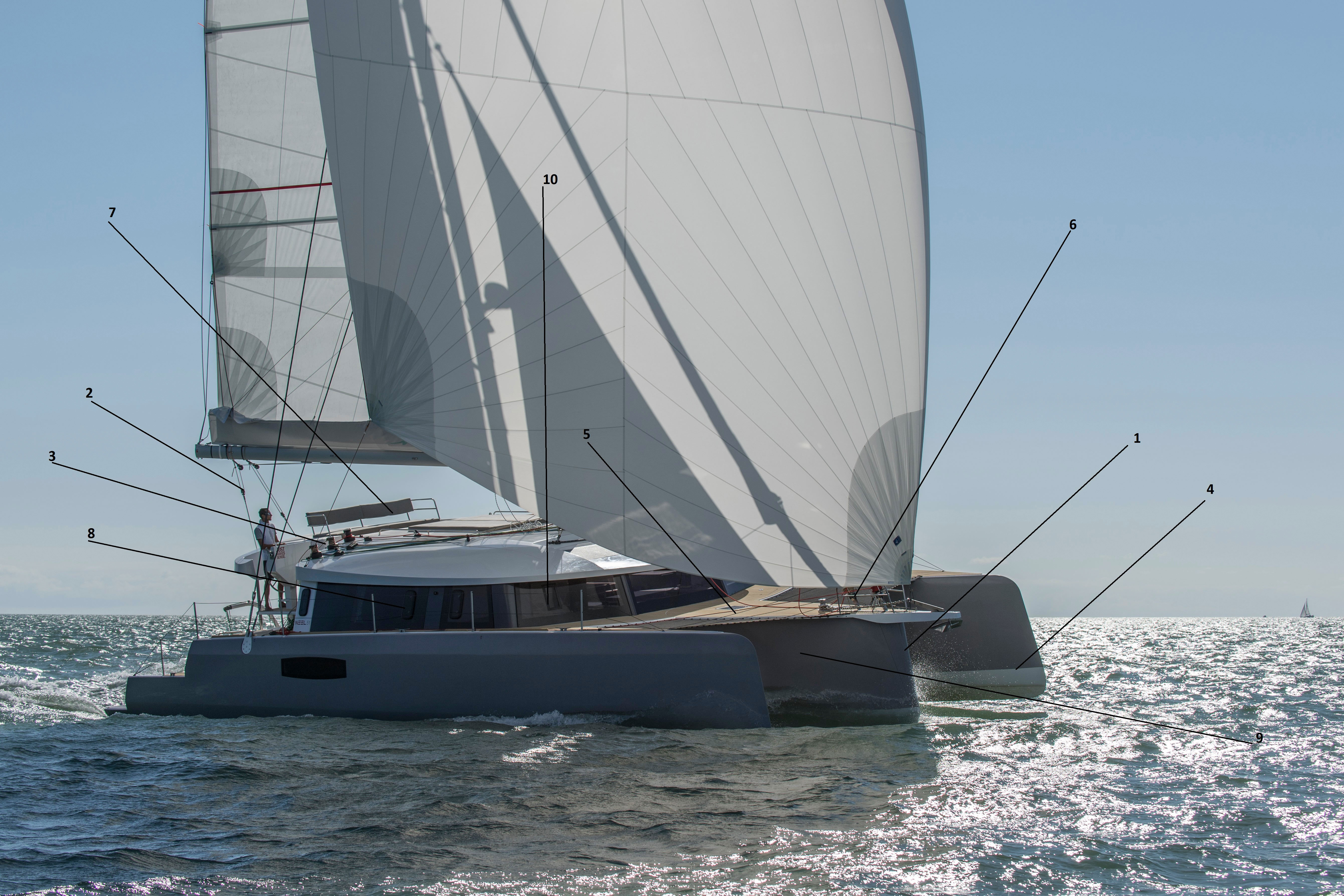 9 : La coque centrale abrite une cabine double à l’avant, mais permet également une implantation futée de toute la technique regroupée dans un local avec hauteur sous barrot !