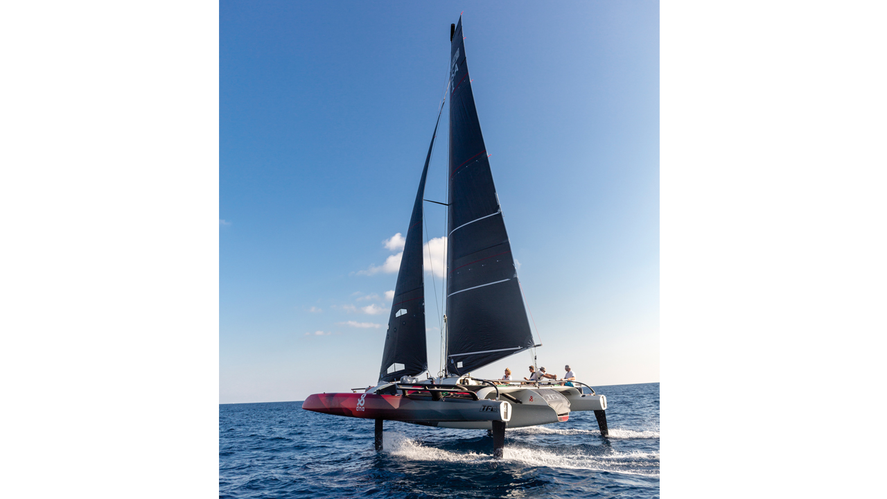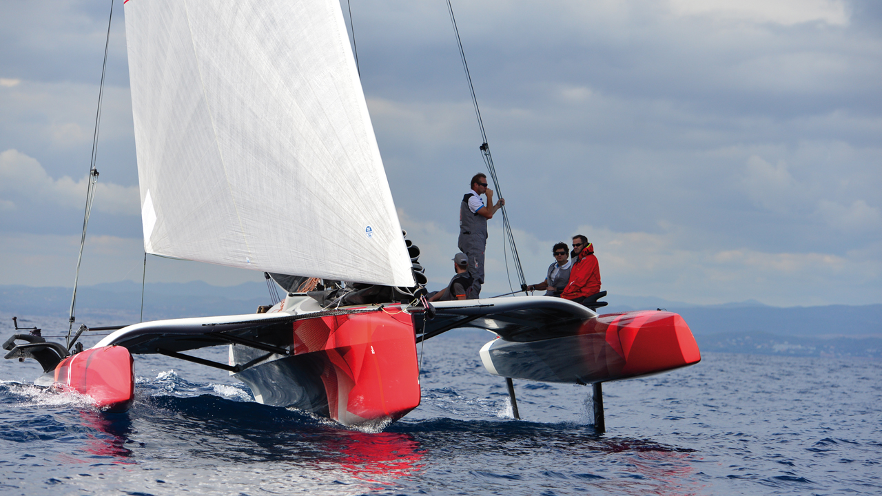 Je suis frappé par la jolie décoration "street art" des coques rouge Ferrari de notre exemplaire d’essai ; elle donne des envies créatives pour personnaliser ce bateau (aisé avec un transfert autocollant) ! Le but n’étant pas de rester discret ; un peu de frime de bon aloi n’a jamais fait de mal à personne ! Le passage récent d’une forte dépression méditerranéenne a cabossé la grande bleue, mais, à l’arrière du déluge, c’est une splendide journée catalane qui s’ouvre devant nous. Le petit moteur hors-bord 4 temps de 6 CV est suffisant pour déhaler le bateau et manœuvrer, il s’escamote complètement dans la jupe via une chaise mobile coulissante sur des rails, et un mesh tendu le dissimule aux regards pendant la navigation. L’envoi de la GV North 3DI black (équipée de lattes carbone et de 2 grands ris) s’effectue en larges brassées rendues aisées par les coulisseaux Antal. Le mât carbone rotatif Southern Spars est superbe, la bôme demi wishbone splendide et astucieuse. Le solent 3DI autovireur sans ris est aussitôt envoyé, et nous démarrons sous les premières risées d’une brise de NW prévue 8-18 nœuds. Première observation : les déplacements à bord de ce trimaran volant sont aisés, le grip sous les pieds est rassurant, et tout a été fait pour un confort ergonomique optimisé. Le revêtement des trampolines (une peau néoprène) est excessivement agréable pour les pieds, les genoux et les mains, il ne blesse pas ; un énorme point fort ! La disponibilité de l’énergie hydraulique qui assiste les appendices et l’autonomie générée par la batterie lithium autorisent 2 journées de navigations pleines avec les réglages de rake (inclinaison antéro-postérieure des foils et safrans) nécessaires ! La manœuvre s’effectue depuis le cockpit via 2 gros boutons up et down pour les foils, et 2 autres pour les safrans. Des rappels visuels (des boules rouges pour les safrans, et jaunes pour les foils) coulissent sur un dyneema fin le long de règles graduées situées sur les bras ; des repères parfaitement analogiques ! Rake positifs minimum pour ne pas générer trop de traînée, nous sortons de la baie et prenons immédiatement du plaisir avec ce multi racé, puissant et léger, il faut gérer la mobilité des équipiers dans ce vent faible afin de ne pas écraser le flotteur au vent et de lancer la machine. Le vent monte (pardon, le trimaran accélère…) et dans une première risée (8-9 nœuds sous gennaker), le bateau soulage et monte gracieusement sur ses foils, c’est assez furtif, mais à la seconde accélération, le vol se stabilise quelques secondes. A moi de jouer, maintenant ! La position de barre est remarquable, l’accessibilité des manœuvres excellente, et la lisibilité du plan de pont d’une netteté impeccable. La courbure idéale des barres carbone, les magnifiques boîtes de safrans articulés, les admirables liaisons (par rotules) avec la grande biellette transversale inter-safrans, le petit stick télescopique et le confort de la banquette composent un poste de pilotage super ergonomique. Le winch Pontos de grand-voile (4 vitesses dont une d’embraque super rapide) tombe sous la main. Je prends mes marques à la barre dans les premières risées supérieures à 12 nœuds, en lofant pour générer du vent apparent, la machine accélère franchement, il faut abattre rapidement en anticipant tout en gardant suffisamment de puissance pour ne pas reposer la coque centrale. Un jeu subtil très addictif ! Le vent rentre au large et la mer devient creuse, agitée par une quinzaine de nœuds ; nous conservons le Code 0, et les premières grosses accélérations se déclenchent. Les réactions de la plate-forme sont vives, mais rassurantes. Une bonne coordination entre barreur, régleur, grinder (pour la voile d’avant) est nécessaire pour jouer des transitions permanentes du vent, de la vitesse et de l’état de la mer. Changement de poste, je me retrouve grinder, en position dans la coque centrale, afin de pouvoir aussi assumer la photo vidéo… pas si simple ! Les accélérations s’enchaînent maintenant par rafales, la mer courte et hachée ne favorise pas un vol stable de très longue durée et les atterrissages sont parfois violents, mais ces acrobaties restent rassurantes grâce à la géométrie du trimaran. Le bruit des appendices est furieux, l’ambiance humide, saturée de spray, le ressenti sous les pieds est magique, fait d’accélérations, fde reinages, de changements de cap pour rester dans la veine de vent. La perception du plan d’eau depuis notre balcon océanique est truculente, le plaisir, maximum ; l’intensité de cette chevauchée n’est comparable qu’à une descente hors piste en poudreuse sur pente forte ! Le multicoque à ce niveau, c’est de l’art ! Nous dévalons la pente depuis plus d’une heure entre 15 et 23 nœuds (avec 15-18 nœuds réels) lorsque le vent semble faiblir, je reprends vite la barre afin de profiter de la remontée au près, mais cela ne dure pas. Il faut régler les appendices pour les conditions à venir, clapot fort, près serré, vent irrégulier ! En m’appliquant, je découvre une autre palette de sensations, celle d’une zone intermédiaire où le bateau profite tout de même de son agilité de foiler sans être en élévation constante, le ressenti de plate-forme est extrêmement plaisant et, alors que le vent s’essouffle, le fait de presque voler, de se déplacer sur l’onde à 10 nd dans un vent finissant procure un plaisir intense. Il y a tant à découvrir avec ce bateau mutant !