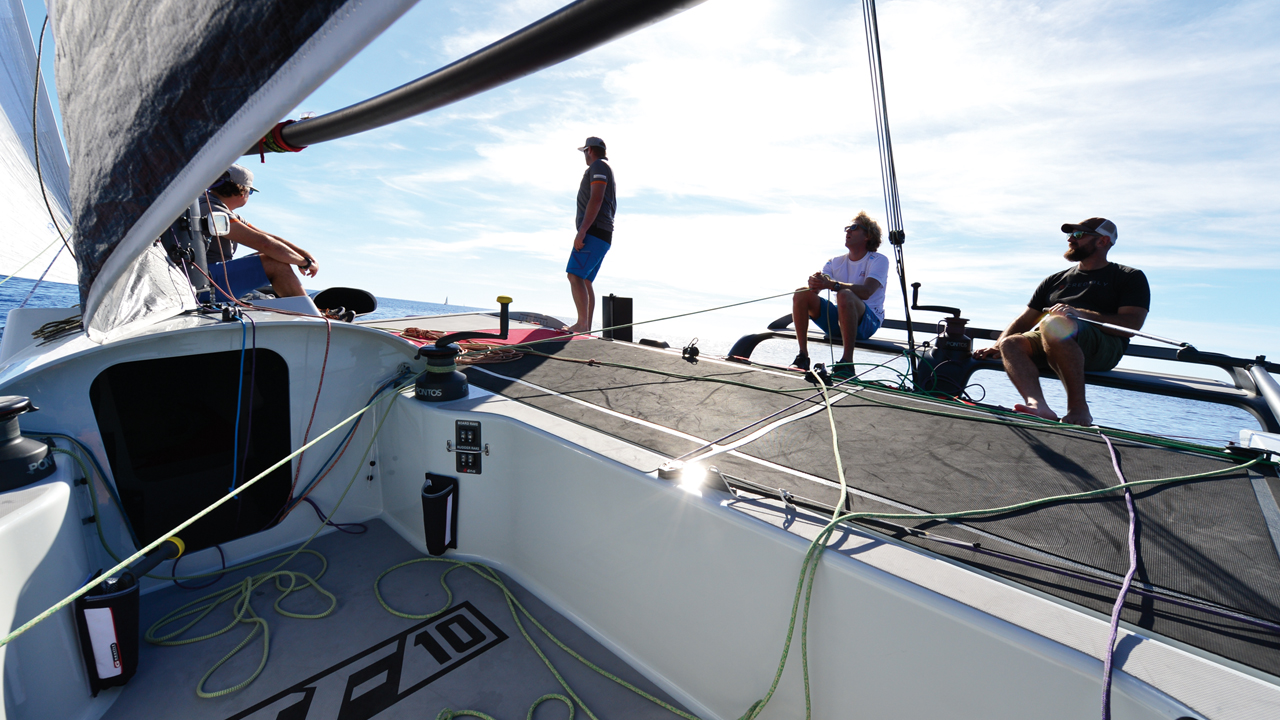 6 : Le barreur, les régleurs de GV et de voile d’avant sont parfaitement à l’aise sur les splendides bancs ergonomiques carbone. Le 4e homme étant dans la coque centrale pour grinder et régler les appendices (ici, c’est un 5e qui est en place).