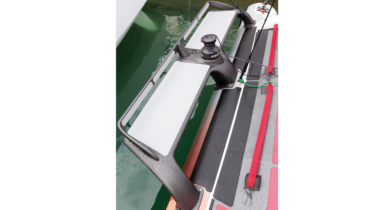 En arrivant à Port Ginesta (Sitges, à 30 km au sud de Barcelone), je découvre une machine de compétition d’une élégance séduisante autour de laquelle s’affaire une équipe bien rodée (ils effectuent des essais depuis une quinzaine de jours). La qualité perceptible du composite est magistrale, la présentation générale, digne d’un prototype GT automobile ; cette petite machine volante est extraordinairement sexy. La qualité de fabrication saute aux yeux : les usinages micrométriques, les assemblages carbone et les finitions bluffantes… une œuvre d’art ! Les sections maîtresses de la coque centrale en U profond offrent le volume nécessaire à une utilisation polyvalente et s’aplatissent significativement vers l’arrière, les entrées d’eau super fines et le rock modéré permettent au bateau de bien se comporter en archimédien tout en générant peu de traînée afin de décoller rapidement. Les flotteurs sont dans la tendance de ce type de bateau très performant : étraves inversées, entrées d’eau ultra-fines et sections aplaties à partir de l’ancrage de bras avant. Le système de repliage d’inspiration Farrier (axe vertical) est confié à des water stays carbone (biellette de liaison articulée bras-flotteur) à l’aérodynamisme épuré. L’accès à bord par la jupe arrière est aisé, le grand cockpit central est réellement confortable, et permet l’accès à bord à des personnes moins expérimentées. L’intérieur est presque digne d’une unité de croisière sportive, et offre deux couchettes simples et des rangements pratiques.