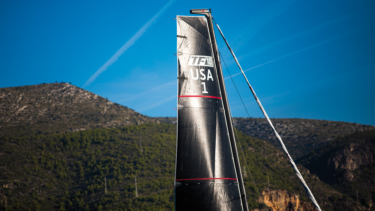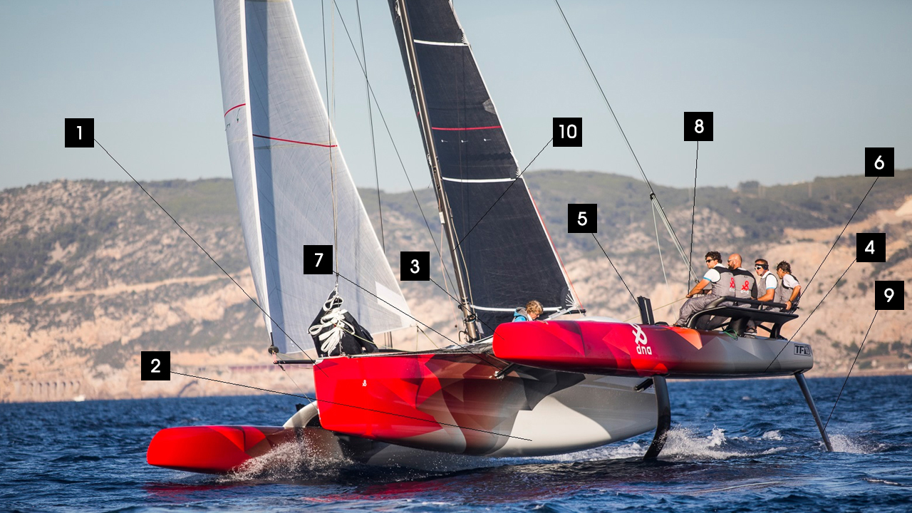 Les concepteurs de la TF10 Association sont partis d’une page blanche ; guidés par un solide sens pratique et une grande expérience, ils se sont immédiatement orientés vers une plate-forme de trimaran pour la sécurité qu’apporte cette géométrie. Dans leur esprit, il n’était pas question de faire fumer des appendices à 30 nœuds le long de la plage pour rentrer au port à la remorque d’un bateau de secours. L’engin devait donc être solide, marin, disposer d’un moteur auxiliaire et être capable de rejoindre son mouillage en complète autonomie en cas de mauvais temps. Le choix d’un équilibre de navigation sur 4 points permanents (les 2 foils et les 2 safrans restent baissés constamment) associé à des profils de foils en Z plus polyvalents et tolérants que les L, et réglables sur 2 axes (et non 3, pas de cantilever comme sur les prototypes AC ou certains nouveaux Ultims), permet d’obtenir un multicoque stable et manœuvrant sans les épuisantes descentes et remontées d’appendices. Le TF10 peut également se comporter (rakes à 0) comme n’importe quel trimaran archimédien repliable si l’état de la mer l’impose. L’asservissement des 4 appendices (réglage de l’incidence ou Rake) s’effectue par vérins hydrauliques reliés à une petite centrale alimentée par une batterie lithium. Génial ! La sécurité et le confort de l’équipage ont également été réellement pris en compte ; ces engins sont rapides, violents, il faut donc se préoccuper de l’ergonomie si on ne veut pas dépendre d’un rescue boat accompagnateur ! Le grand cockpit central constitue une zone de manœuvre particulièrement pertinente qu’une configuration de catamaran n’autorise pas. Restait l’épineuse question des trampolines, toujours très inconfortables et glissants (surtout les mailles fines Spectra en tension maximum requises pour ces bateaux, j’ai souvenir de ceux de l’AC50’, une tôle !) ! Des plaques de carbone souples recouvertes d’un élégant néoprène à fort grip ont résolu ce point névralgique avec succès, tout en contribuant positivement à la raideur de la cinématique de repliage. Les sièges latéraux en fibre noire (wings) faisaient partie intégrante du design brief afin de permettre une navigation agréable et sûre sans la présence d’un tender rapide pour récupérer les chutes d’hommes à la mer ! Ils permettent un pilotage confortable, un rappel et un accès délié aux réglages pour un équipage de 4 personnes. Avant de griffer à toute allure le bleu sauvage, il faut amener le bateau sur le plan d’eau dans les meilleures conditions ; le transporter et le stocker au sec ou à l’eau ! Le concept de trimaran repliable au gabarit routier résout une grande partie de l’enjeu ; la possibilité d’insérer les foils par le haut exonère de la présence d’une grue, et il est possible de mettre à l’eau sur un plan incliné ! Ils ont vraiment réponse à tout, les gars du NYYC ! Le groupe de conception s’est adressé au cabinet Morelli-Melvin, chargé de mettre en partition cette équation complexe ; après validation des premières études, un concours de constructeurs a été organisé dans l’esprit d’une parfaite monotypie ; c’est le chantier hollandais DNA qui a remporté le challenge.