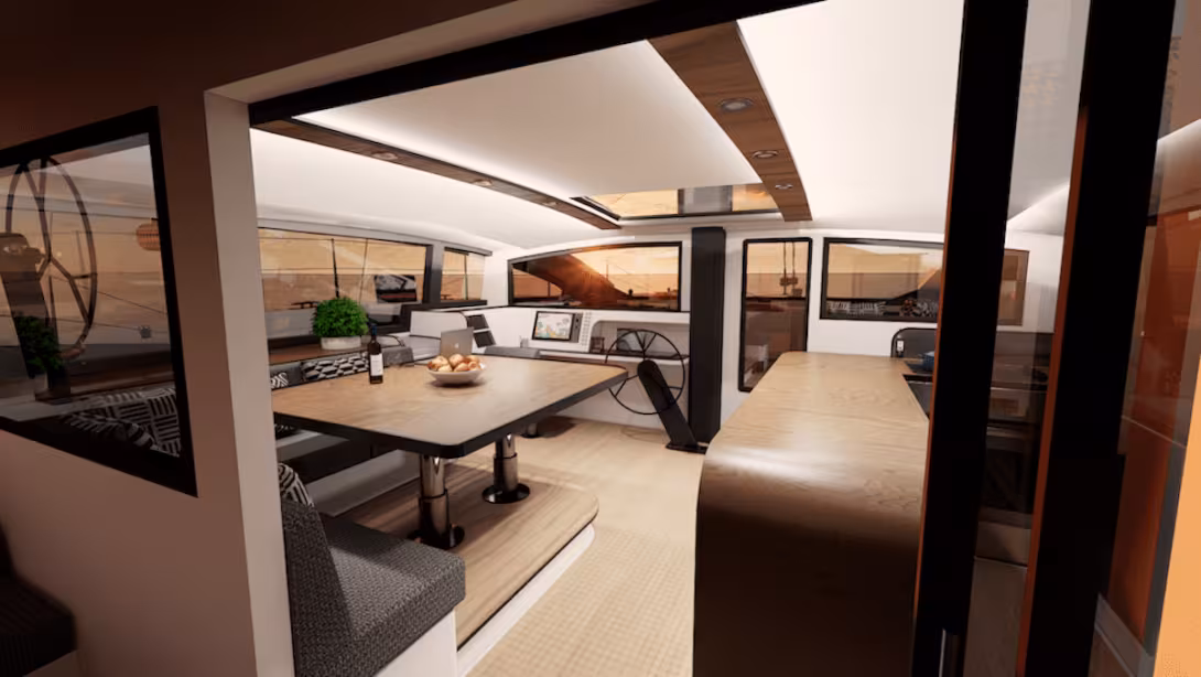 The main feature of this Dazcat is the adoption of a forward cockpit/maneuvering station, with the wheel just behind, at the front of the nacelle. Another helm station is located mid-height, to starboard. This new Dazcat maintains a strict weight schedule, with carefully centered masses, and is able to take the ground thanks to its shoal draft when the appendages (carbon daggerboards) are raised. As for the bimini, this has been designed to optimize the surface area of solar panels, which also largely cover the dinghy on its davits. Optionally, the Ocean Cruiser can be propelled by a hybrid diesel/electric drivetrain.