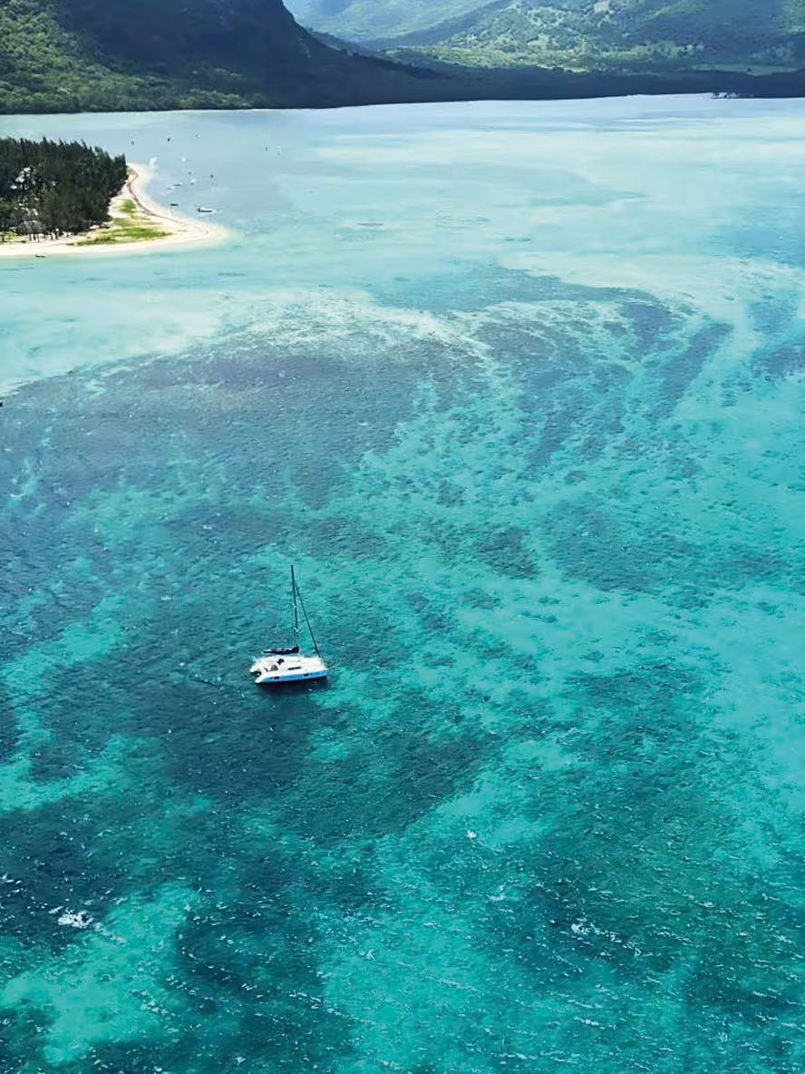 Our last publication was two years ago, in Multihulls World #172, when we were stuck in Madagascar. But what a privilege it was to be there when the whole world was at a standstill or almost! Since then, we have sailed several thousand miles. We left Madagascar from the north and stopped at various islands in the Seychelles archipelago, before arriving in Mahé. We stayed there for a month to refit the boat, and we took the opportunity to make some improvements, especially on the sugarscoops. We then headed for the Mascarene Islands, Reunion and Mauritius. Today we would like to share with you a little corner of Mauritius: the jewel of the south-western tip of the island, Le Morne Brabant. We reached it by a channel, where we were often accompanied by dolphins. The anchorage is fairly rough, and as a surfer, nice, manageable waves are just what Steph wants. We anchored at a depth of 10 feet/3 meters in this translucent lagoon. A ray often came to shelter under the hull. Le Morne is also known for its underwater waterfall, a rather surprising geological phenomenon: a sand waterfall that starts from the bottom of the abyss creates a waterfall effect with several shades of blue. Ashore, it’s the shades of green which take our breath away. The landscapes of this imposing, historic mountain are wonderful. It was a refuge for runaway slaves, a symbolic place therefore of freedom and sacrifice.