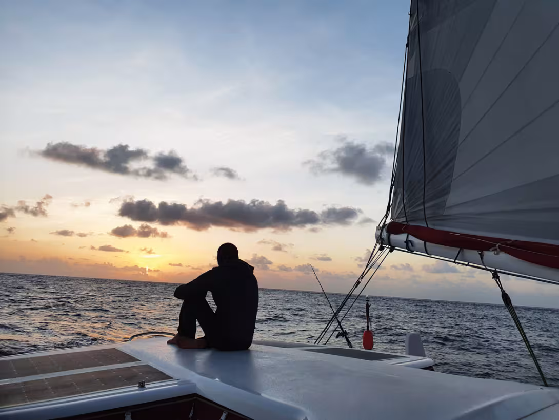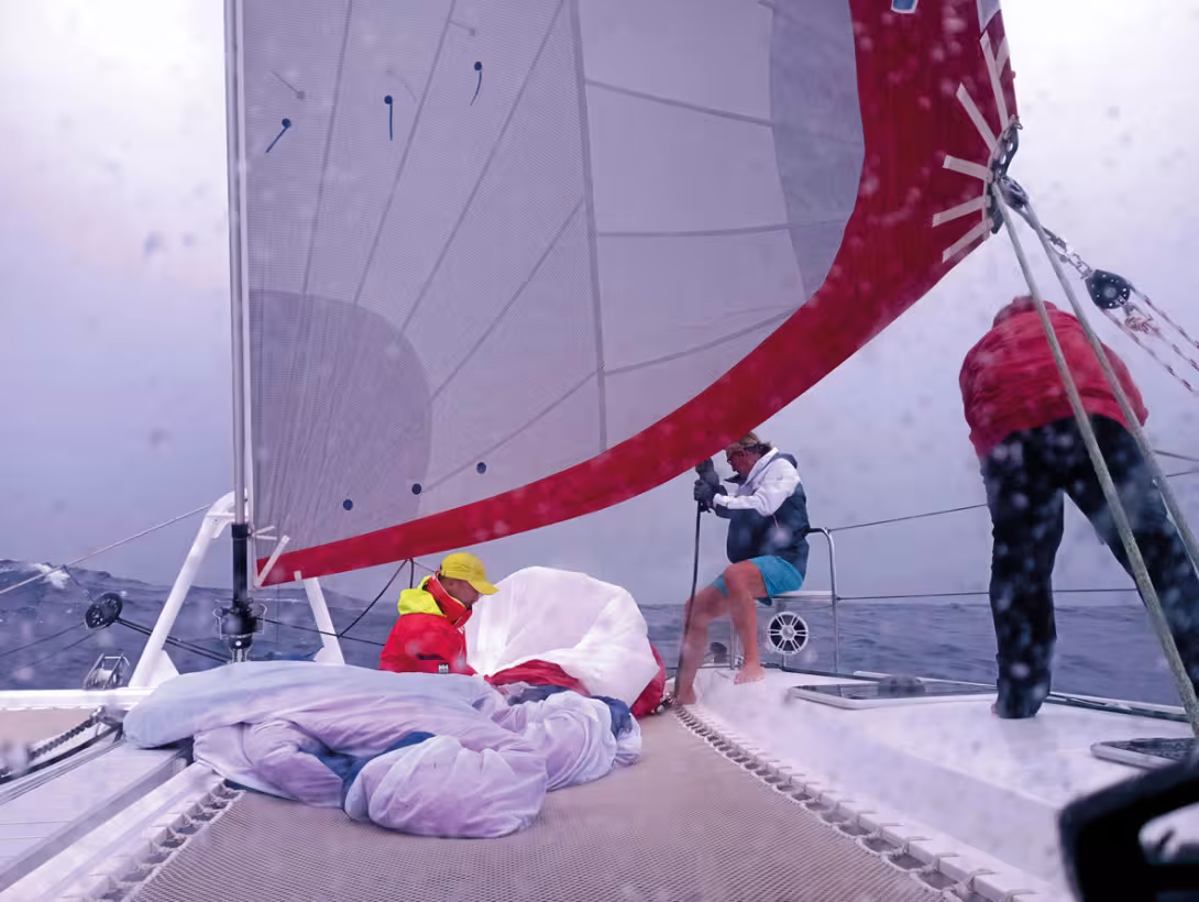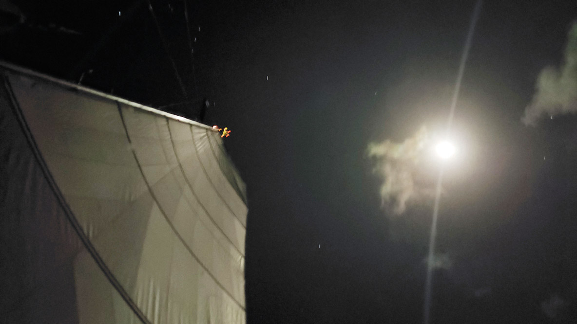 240 Hours into the race. We are officially ranked first in the daily list. We continue to outrun our competitors at an average rate of one nautical mile every hour. It’s up to us to keep up the momentum! A squall catches up with us in the middle of the night (downwind, the clouds come from behind). The squall, first detected visually, is confirmed by the radar - the precipitation is clearly visible on the screen. The spinnaker is lowered. The wind (maximum 25/30 knots) and the rain are finally only moderately strong. False alarm, the wind doesn’t rise further. We hoist the spinnaker back up and let the squall pass us, enjoying the wind (the warm rain, not so much). Later, as the squalls pass, we sail dead downwind, gooosewinging with the genoa, and then we try, without any convincing result, the big heavy symmetrical spinnaker.
