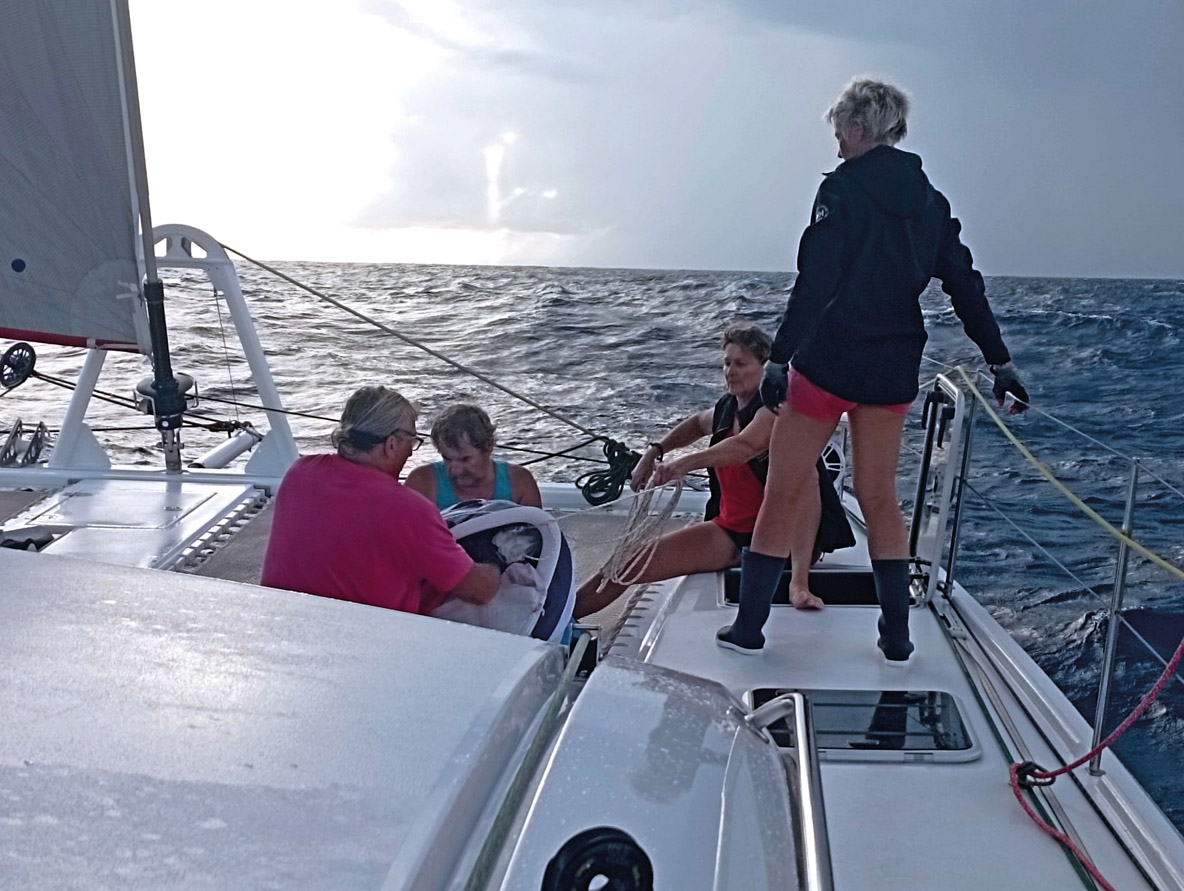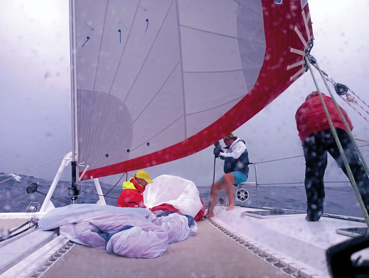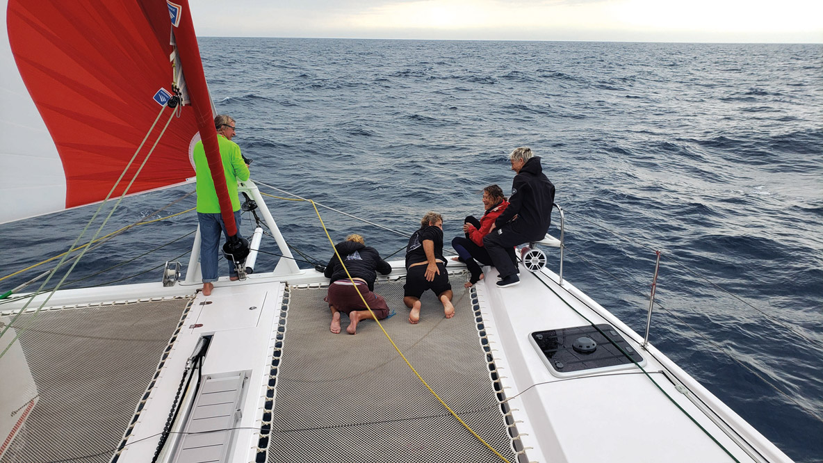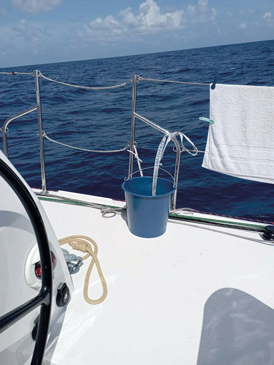 We’re able to produce fresh water and electricity on board. However, this requires the engines to be run out of gear. The freewheeling propellers slow our catamaran down. Having decided to go for the overall ranking as far as possible, we decided to make only 50 gallons of water, which should allow us to last until the finish. Let’s go for seawater showers. Be careful! Getting a bucket of water at 10 knots is not that easy...