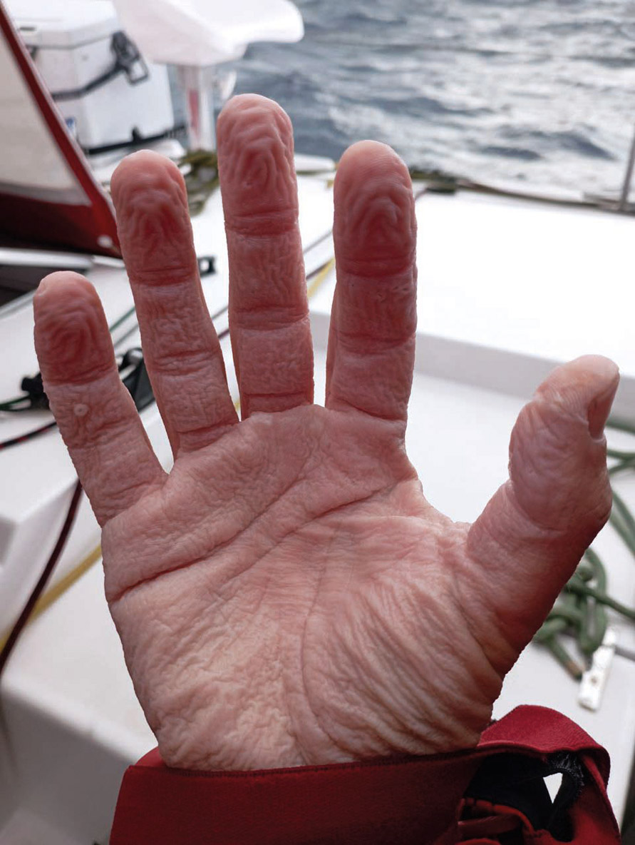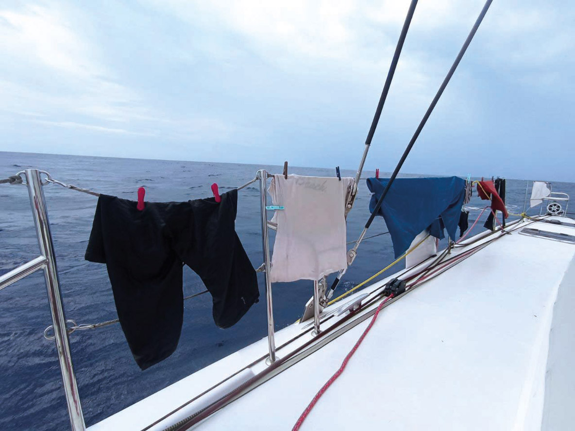 The squalls present the opportunity of being able to do some laundry, since we’re able to catch some fresh water. The difficult part is drying it…