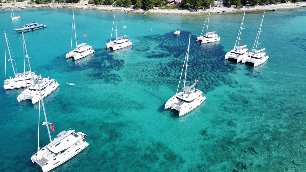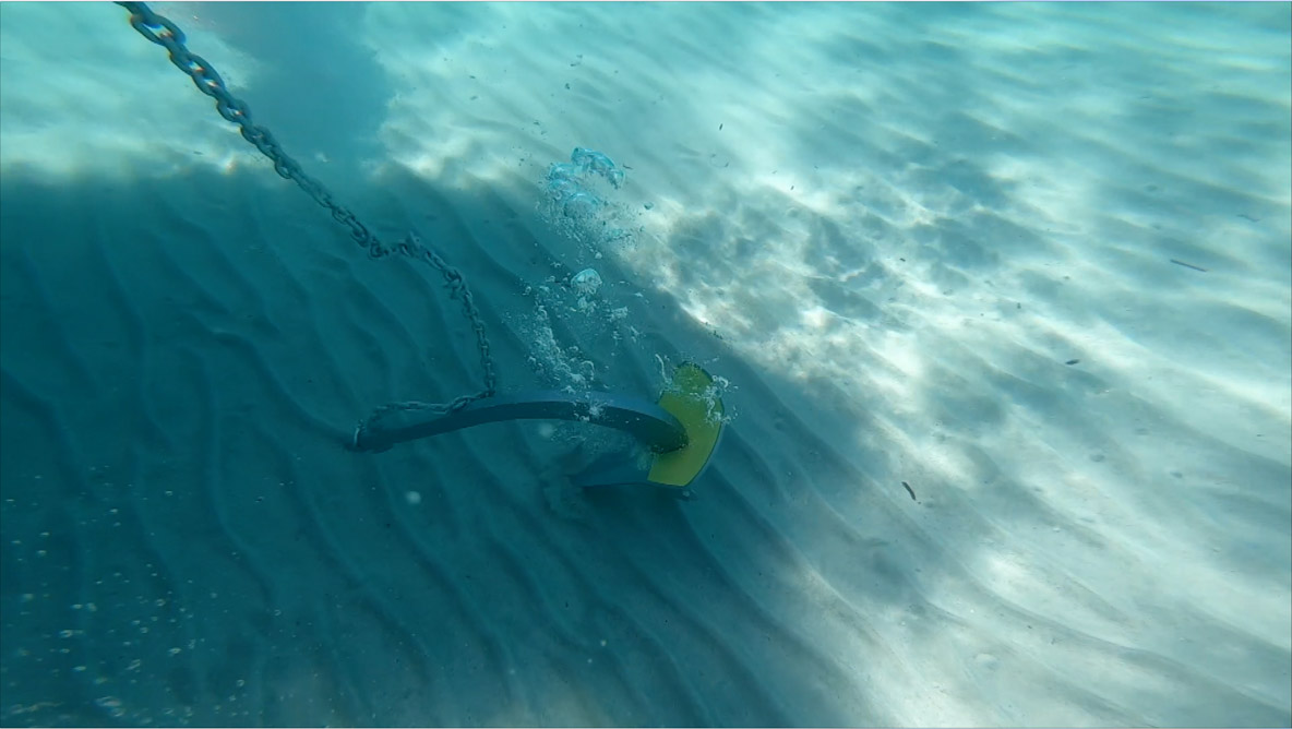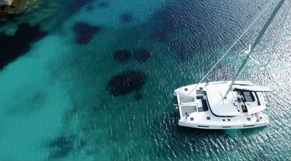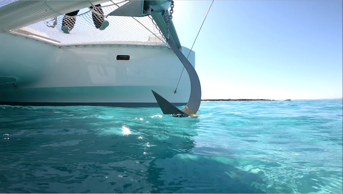 Drop and weigh anchor with your chain vertical and line with the multihull so as not to plow the bottom by hooking or dragging.