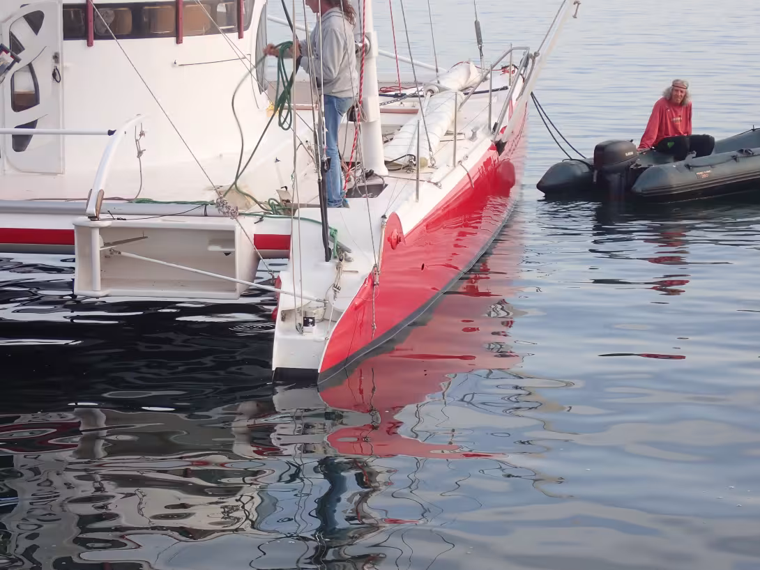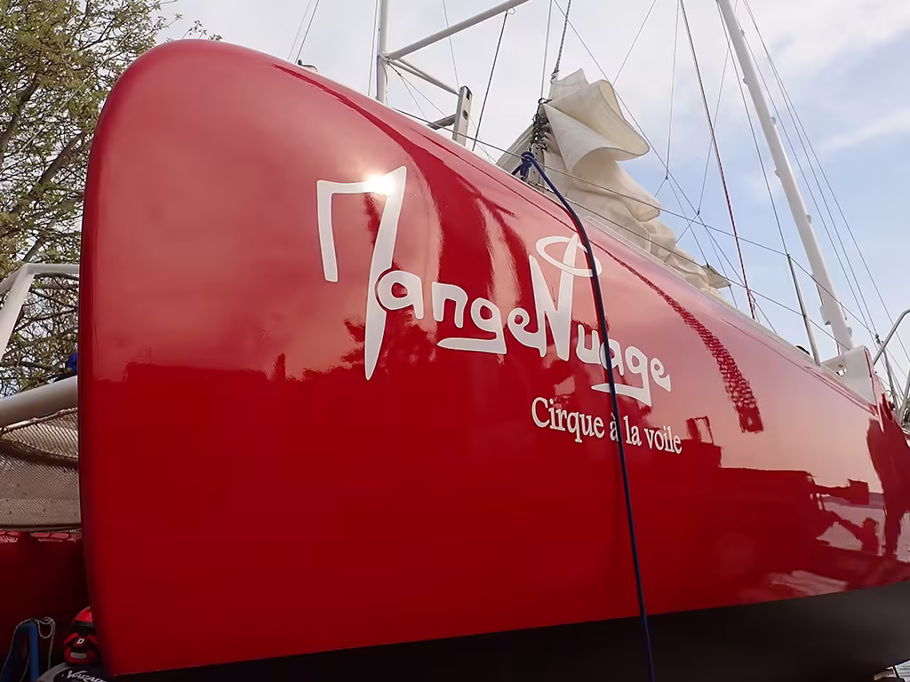Five years’ work ashore, some initial seatrials, and another winter devoted to finishing... and painting: it was Craig Alexander, a loyal member of the Golden Oldies galaxy, who took on the task, using a red lacquer to the most beautiful effect. MangeNuage is an attractive example of recycling an old racing multihull - which could provide a few ideas! “Awlgrip Quick Seal Primer applied first thing in the morning and then 3 coats of Epifanes Speed Coat, you can finish a boat in one day. It is a fantastic system as there is no sanding involved between primer and finish paint” says Craig. MangeNuage is an attractive example of recycling an old racing multihull - which could provide a few ideas!