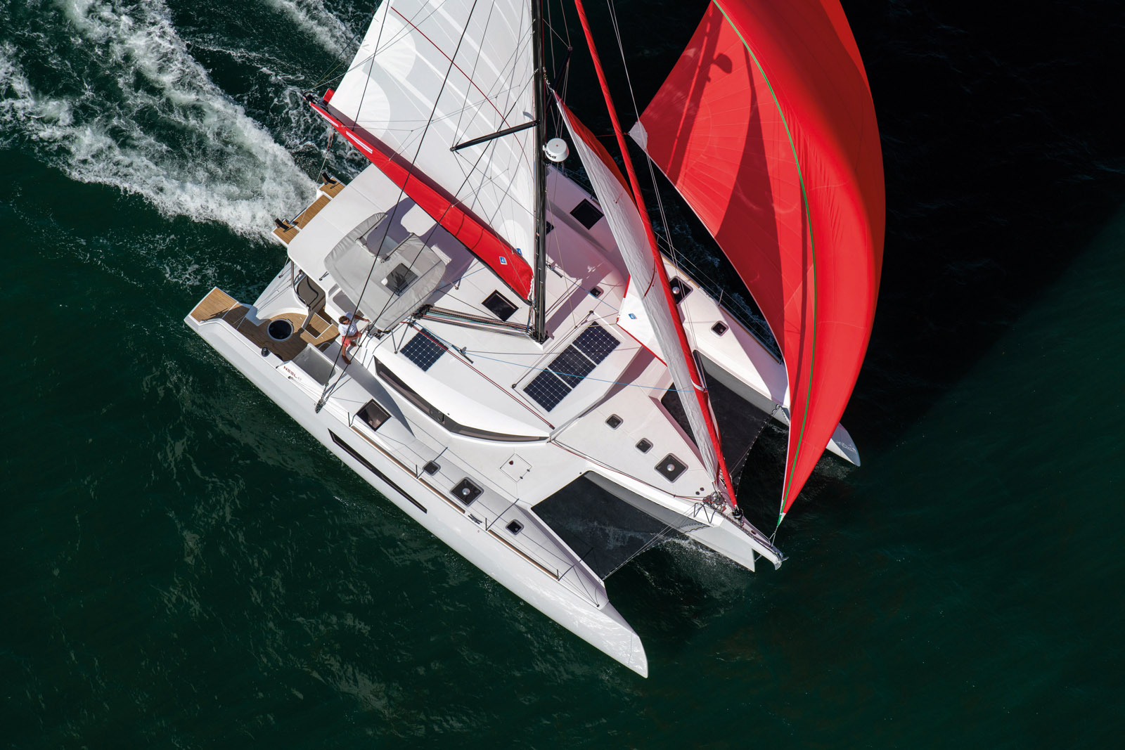 Presented for the first time at the Cannes Yachting Festival, the Tanna 47 is a successful and intelligent redesign of the Saona 47. The overall characteristics - rig, displacement and deck layout – all remain identical, but the nacelle has been reworked to feature new furniture with softer angles, larger overhead windows, but most importantly, a new galley – gone is the central island, but there’s now an extra 10.6 cubic feet (300 liters) of storage space. Like the latest models in Fountaine Pajot’s sailing range, the Tanna 47 has a lounger right next to the chart table. A perfect place for the watchkeeper... but also for relaxing. Outside, behind the raised helm station, the lounge area has doubled in size. A large area of solar panels (50 to 100 sq ft / 5 to 9 m²) can be fitted.