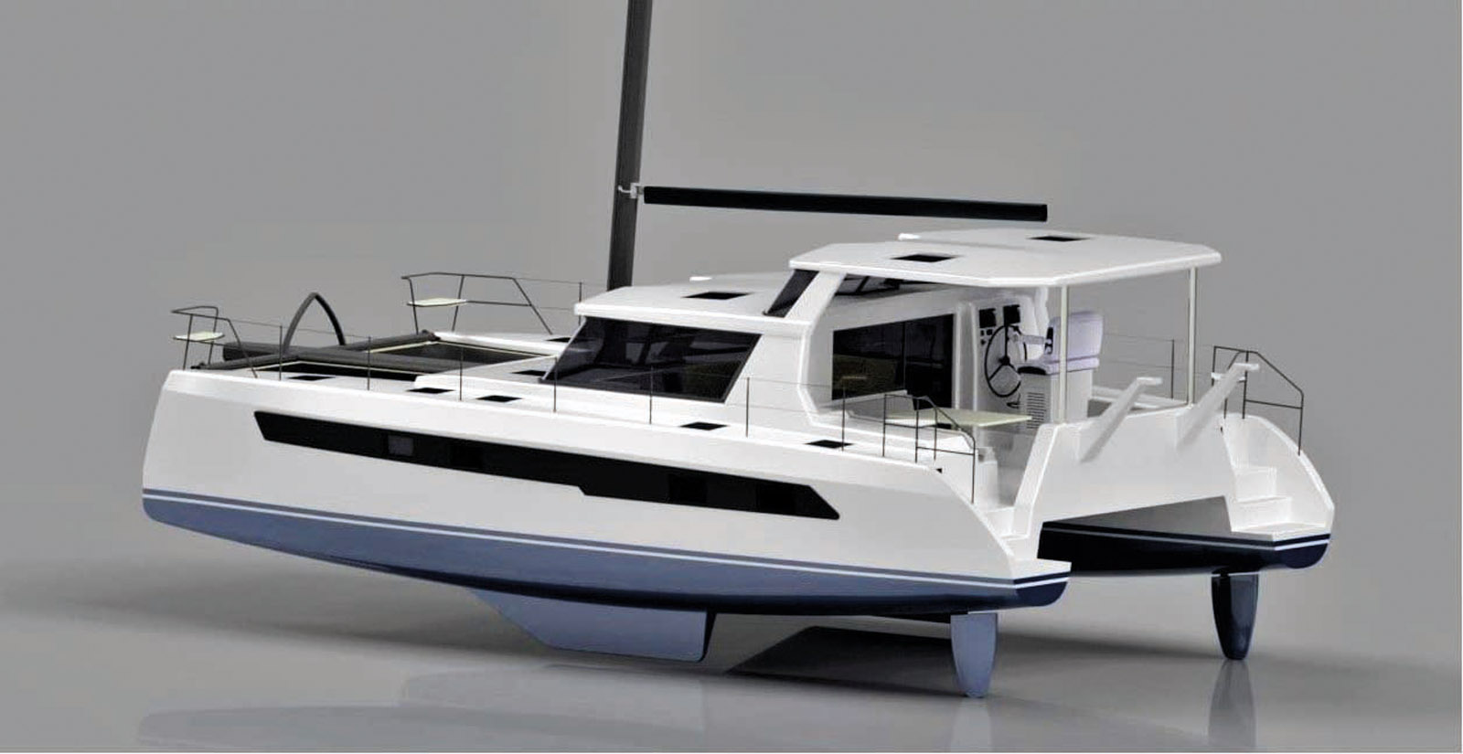 Until now, St Francis Marine’s catamarans had been considered to be extremely solid but having a very traditional design, like the St Francis 50 MK2 with her sloping bows, just like her coachroof... The brand-new St Francis 46, announced by the South African builder on July 6th, is a real break from the codes. The design, from renowned architect Anton Du Toit, is undoubtedly the major factor. The surprise is a much higher and generously glazed nacelle, inverted bows, ultra-taut hull lines and maximum openness between the saloon/galley and the cockpit. The builder has even provided a home cinema area. On the other hand, the principle of the raised helm station and bimini has been retained. The St Francis 46 will be available in a three or fourcabin version.
