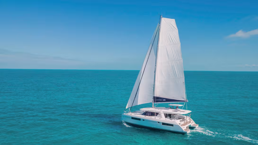 In 2017, with their 45, Robertson and Caine offered an attractive catamaran: this model satisfies the expectations of charterers or owners who are sensitive to the concept of open spaces. A successful model that continues to evolve: the brand-new Lounge version with a fitted-out flybridge appears very popular, to the point of eclipsing the original configuration During our test, we appreciated the design of the hulls and the seakindly behavior under sail. The forward cockpit, accessible from inside, has become emblematic of the Leopard range: a definite asset for hedonistic sailors - and for all a must at anchor to enjoy life on board. The forward door is also an excellent way to ventilate the saloon in the tropical sun.