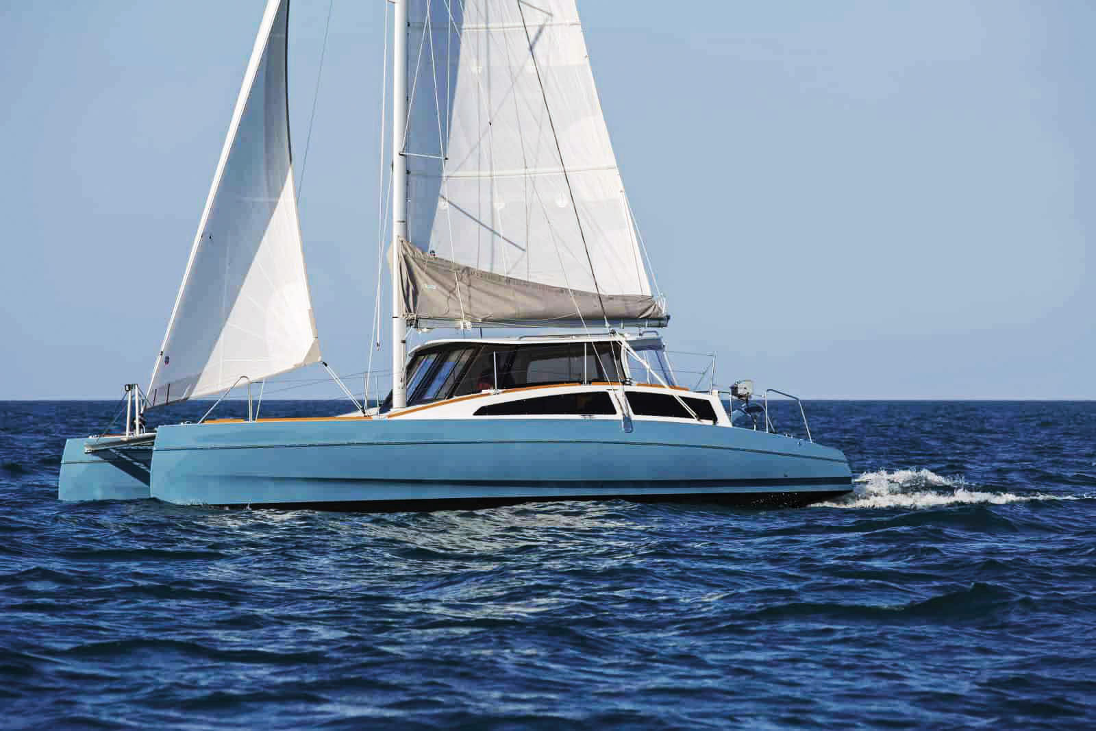 Under sail, the Broadblue Rapier 400 shows great potential and performance that matches her sporty appearance. The nacelle, which at first sight seems rather low, doesn’t slam at all. But it is the life-on-board aspect where the 400 surprises, with a semi-covered saloon/cockpit concept and superb interior layout in the hulls, making this nothing like any other 40-footer on the market. Under way as well as at anchor, the ergonomics work, the flattering silhouette really stands out and living on board this almost open-version is very pleasant. Note the numerous possibilities for customizing this catamaran depending on a more or less cruising or performance-oriented program - the Clubman version shows good racing skills.