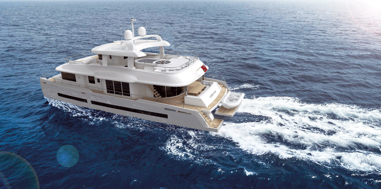 Australian specialist in aluminum yachts, Echo Yachts is offering a catamaran built for blue water cruising or exploration. The deck plan, at 43’8” (over 13 meters) wide, offers a huge hydraulic platform at the stern. A pair of jet-skis and a 21-foot (6.4 m) Extender tender will be able to be carried without difficulty. Inside, the shipyard is offering spacious living areas, four or five guest cabins and a large Owner’s Suite, forward on the main deck.