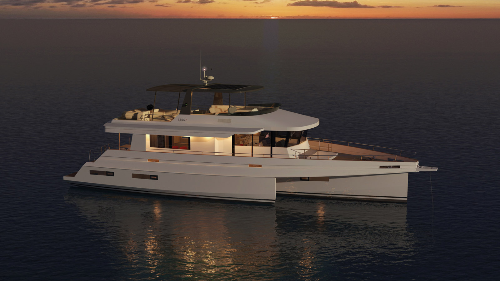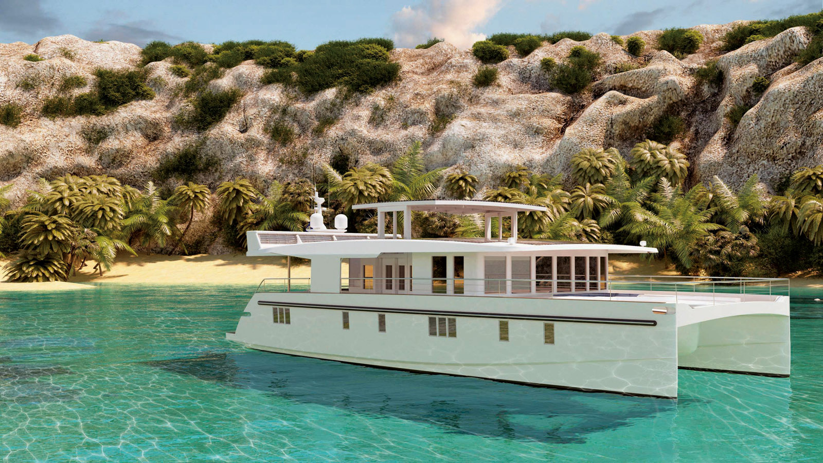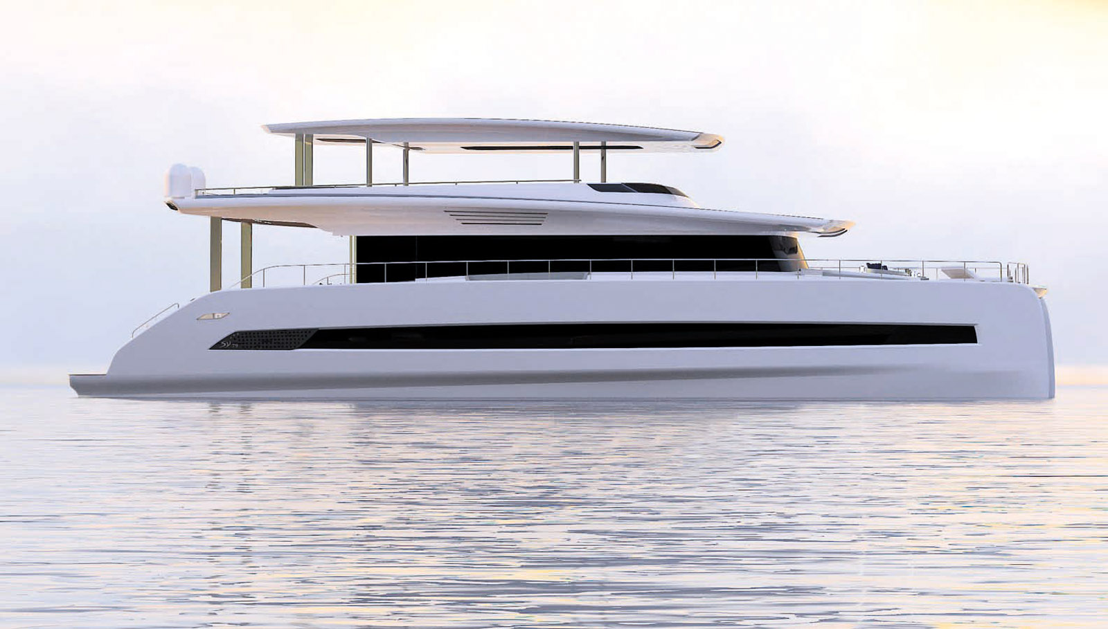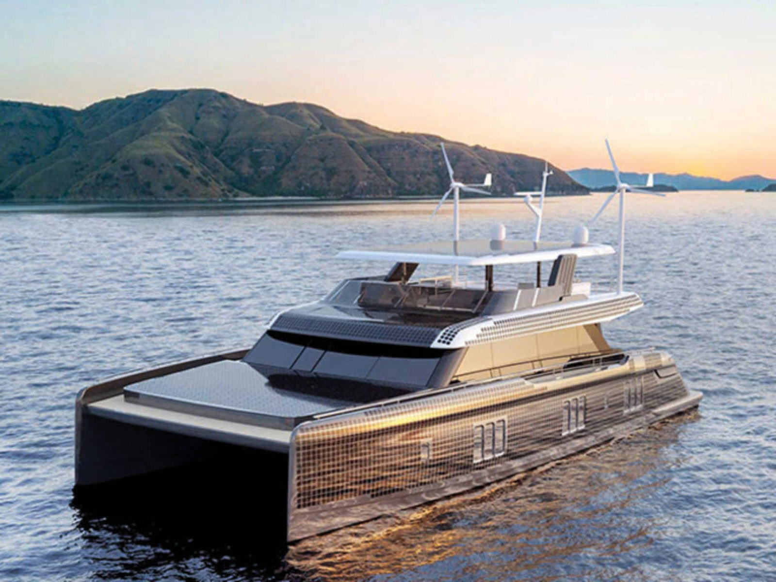 This catamaran in now in build: this model, the big sister to the Serenity 64, will be powered by solar energy thanks to its 1,200 sq ft of panels and two electric motors of 25 kW, or more traditionally by two 435 HP diesel engines. The cruising speed in electric mode will be 6 to 8 knots compared to 10 to 12 knots with internal combustion - expected peak speed is over 20 knots.