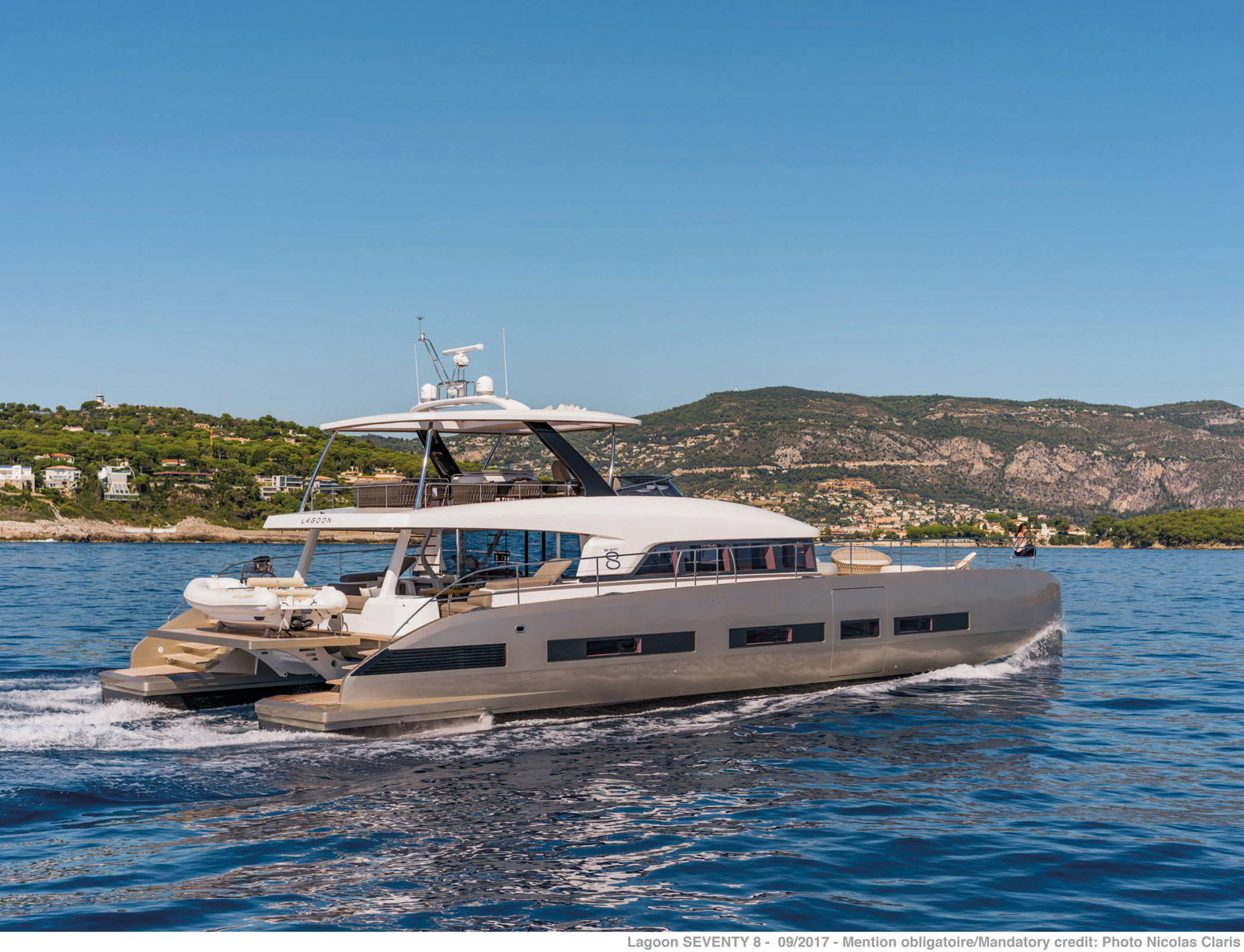 The SEVENTY 8, flagship of the Lagoon powercat range is seeing great success. The aft third of the Seventy 7’s (the sailboat version) underwater hulls have been redesigned to accommodate twin 510 HP engines as standard. As for the forward trampolines, they have been replaced by a rigid teak-covered platform, bringing the usable surface area outside to over 1,600 sq ft/150 m2. The features are undoubtedly luxurious; the various design options - with meeting room or massage room - as well as several decorative atmospheres planned in the catalogue from the outset make this a semi-custom yacht in series production. They have retained the doo in the topsides of the owner’s cabin, which transforms into a terrace at anchor. The aft galley is remarkable, both for the crew and the owner.