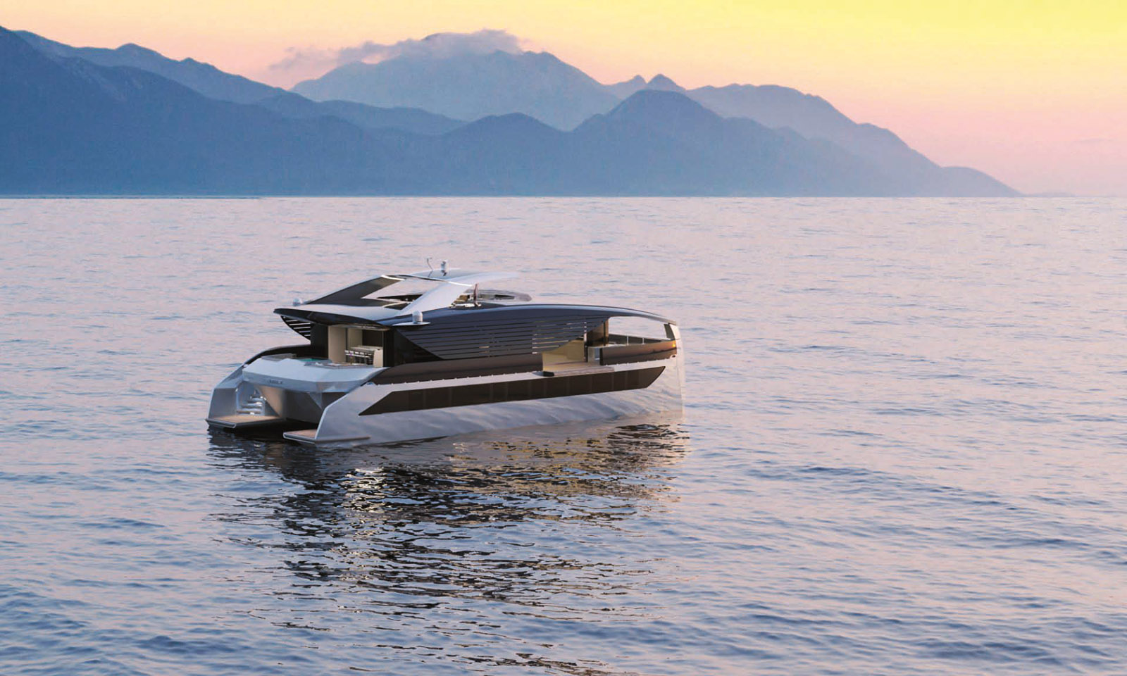 Based in Cannes in the South of France, designer Alexandre Thiriat is also embarking on the hydrogen adventure: he is proposing the Corellian 110, a 33.5-meter (110-foot) catamaran made in recycled aluminum that incorporates a hydrogen fuel cell system in addition to electric propulsion and an array of solar panels. The multiyacht, powered by two 500 kW electric motors, should be able to reach a maximum speed of 18 knots. Its cruising range should be unlimited. The Corellian 110, designed for 8 to 12 people, offers more than 2,150 sq ft (200 m²) of interior space and 2,000 sq ft (186 m²) of deck space.