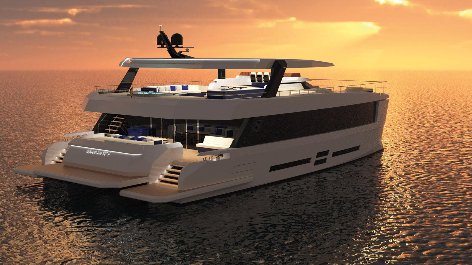 Italian design and Spanish construction: that’s the recipe announced for this new tripledecked catamaran. 2,700 sq ft (250 m²): that’s the incredible area of the flybridge on this 86-foot multiyacht. The living space offered by the Spaceline Concept 86 is almost double the usual figure that you would expect to find on a catamaran of this length, and the massive flybridge gives an idea of the Space Concept that the designers have incorporated into this model. The living spaces and cabins have been designed in the spirit of a luxury hotel. As for the engine rooms, hybrid propulsion is recommended. The builder announces an excellent quality/price ratio - a rather rare and offbeat preoccupation in the multiyacht market.