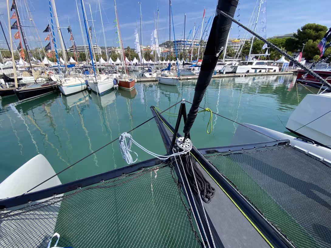 The IC36 that we've been waiting to see for many months now is one of those multihulls as original as it is exciting. The boat is on display just a short walk from Cannes' famous La Croisette boulevard and is is a real eye-catcher with its modest size, carbon everywhere, its rotating mast, its completely open nacelle and its central galley table. The hulls are still fitted out, don't worry! During this very first visit, we were hugely impressed by the quality of construction and the quality of finish from the Czech manufacturer. As announced, this dismountable and transportable catamaran is equipped as standard with an Oceanvolt electric drivetrain - recharging is ensured thanks to solar panels and hydrogeneration. This model is also available in the Pacer version, equipped with diesel engines.