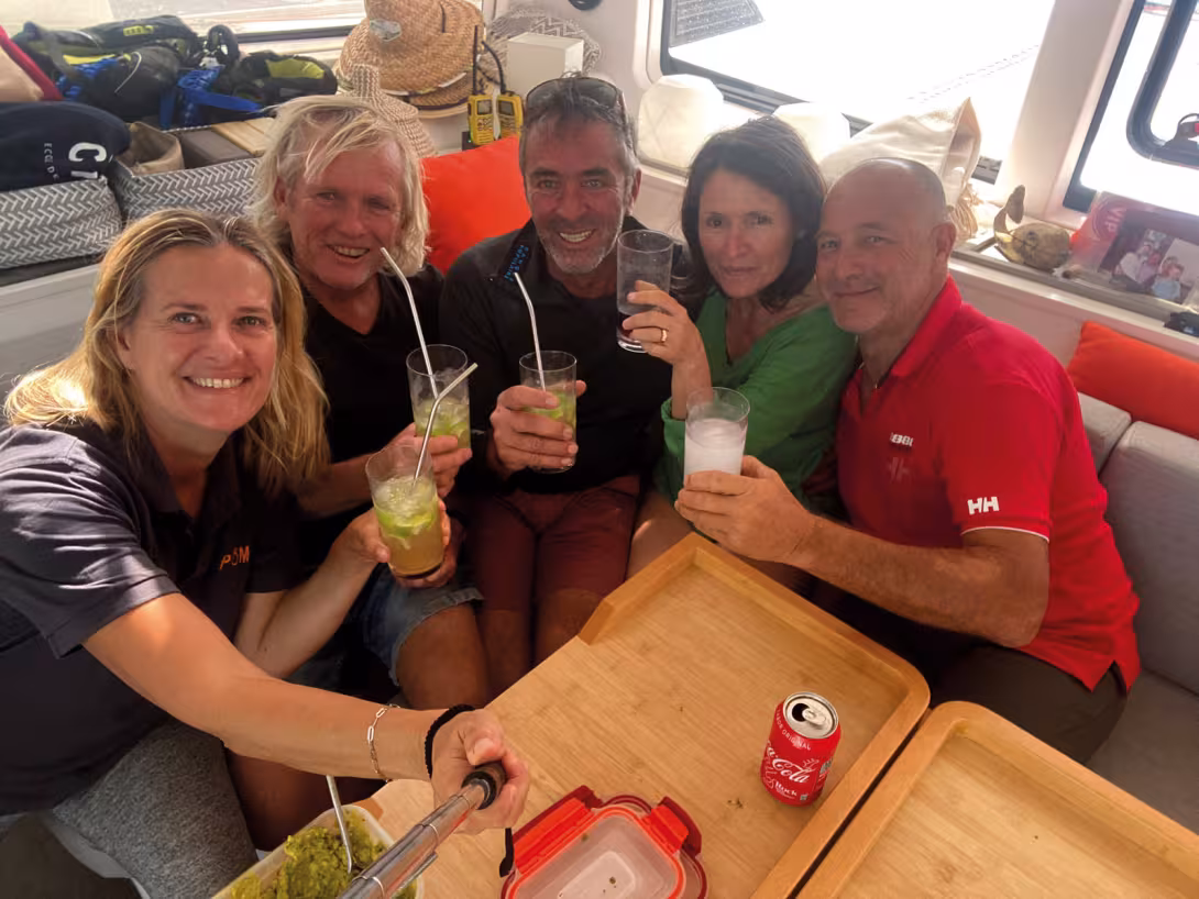 There is no longer any land on the horizon. There is only the sea as far as the eye can see. We are serenaded by the sound of the waves breaking on the hulls, the squeaking and clanking of the halyards, the creaking of the blocks, the lines and cables stretching... We set off to cross the Atlantic under sail. As we have the wind behind us, we have to tack to keep a course towards Saint-Martin. From time to time, we are visited by a pod of dolphins. It’s always magical to see them swimming around us. Tonight, they came close to the hull in small groups and then swam around Pom for a long time. Squatting at the front of the catamaran, we were so close to them that we could almost touch them. And then they left as they had come, disappearing into the depths of the ocean. On the fourth day, the wind picked up to 20 knots and Pom started to accelerate. We covered 236 miles in 24 hours. Today is Sunday, and the bets are on! We have to guess our arrival date. The winner will have the privilege of offering the first round of mojitos! The weather forecast confirms a good breeze which will allow us to stick to our objective of 250 daily miles. Our bodies are starting to get used to life on board. No more nausea, headaches and just wanting to sleep, which are the main signs of sea sickness. We have just done another 238-mile day. However, this transatlantic crossing is not always a smooth ride and sometimes we have to maneuver, like in the middle of this afternoon when a threatening squall arrived. We went under staysail. We even had to take in the second reef. This type of effort is incompatible with a hearty meal, and with 30 knots of wind, in heavy seas, the maneuver is double the work. We were exhausted by this «unwelcome» effort. One day follows another. 206 miles in 24 hours. «We are slowing down», says the captain. The reefs are shaken out, and we start sailing again at 12 knots. Saint-Martin is not far away. We will have crossed the Atlantic in 17 days and covered 3,280 miles.