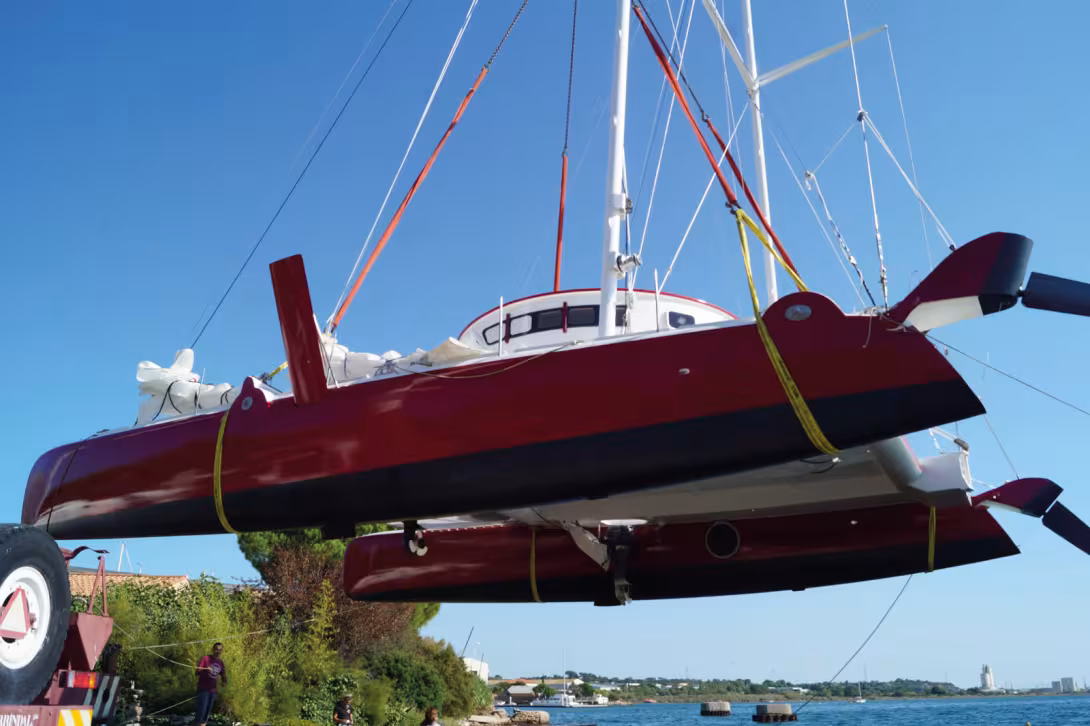 MangeNuage is an atypical catamaran that immediately catches the eye. If it gets noticed, it is not just because of its vibrant red color. It’s also the double rig and its circular stage which make it a unique multihull. Originally, the Formula 40 had no deck or living area. Designed exclusively for racing, it was as streamlined as possible: two hulls, linking arms, a mast and shrouds - the rest was just textile. This new version of the catamaran was created to serve as a floating stage and swinging trapeze structure. However, there is no question of MangeNuage staying in port and having the local oysters grow under its hulls. This is an itinerant project, and does not only use the sailboat as a set and artistic support. The multihull is also a home and a means of transport for the artists who use it during their tours. All of this is the culmination of a long journey that has been undertaken by Anne. In 2015, she was looking for a catamaran that could be used as a prop and a stage. She was in contact with the naval architect Denis Kergomard (Alibi Architecture) who helped her in her search. After having explored several multihulls, they chose two Formula 40 hulls that had been abandoned in a shipyard in the Thau lagoon. This catamaran was Totem, formerly Data General. It was a racing catamaran that had been built in 1987 by Jeanneau Techniques Avancées using the plans of the architect Nigel Irens and skippered by Pierre Le Maout. With its foils, the boat was very successful and was bought by Yves Parlier. It was then sold and used for day trips with guaranteed thrills in Palavas in the Gulf of Lion. After being struck by lightning, the catamaran was taken out of service and dismantled in 2010. So there it was, awaiting a new destiny, at the back of the Navibois yard, in Sète.