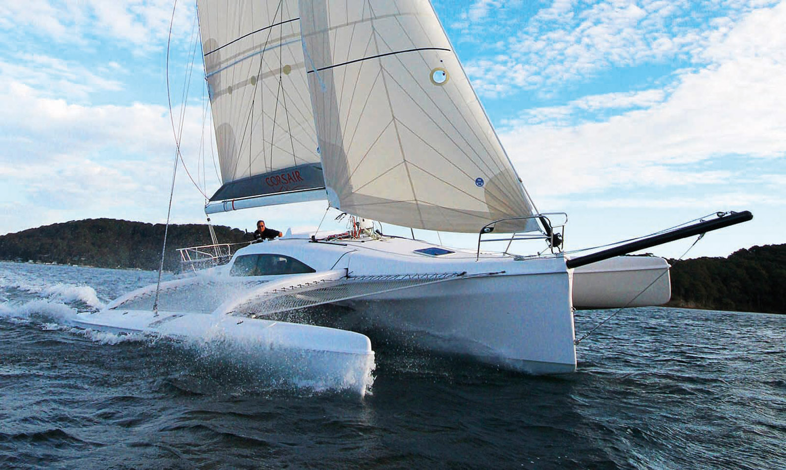 The plus: a fast multihull that’s fun to helm, with a reduced beam of 10’ (3 m) in port.